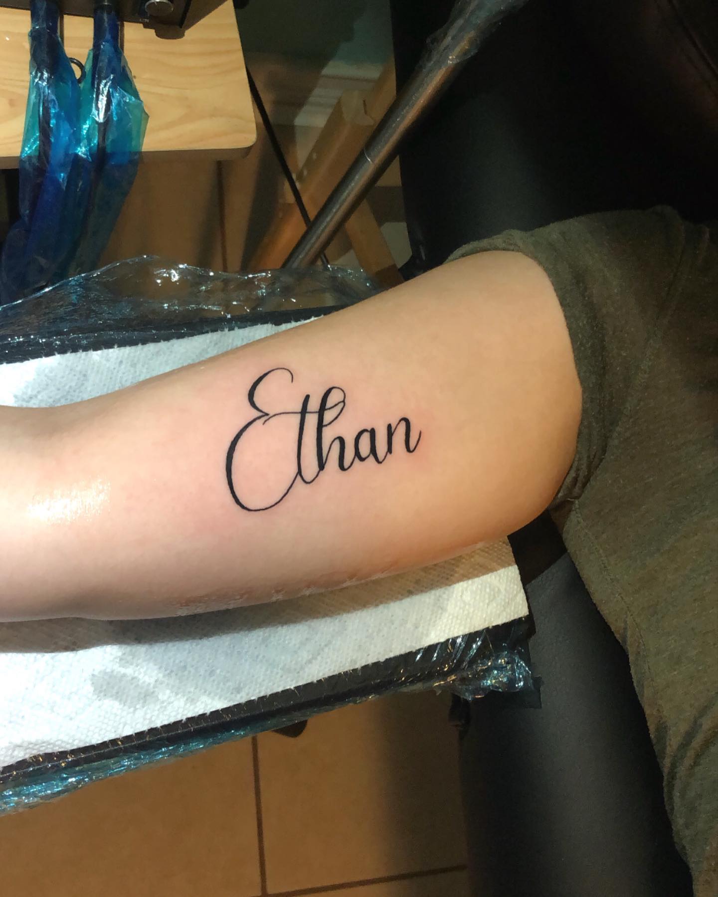 The placement makes this tattoo feel intimate and meaningful, perfect for honoring a child’s name in a subtle yet confident way.