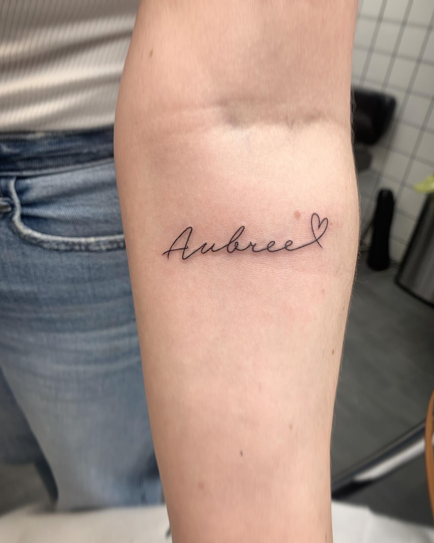 A small heart placed at the end of the name adds a gentle emotional accent without distracting from the lettering. The placement follows the natural line of the arm, giving the tattoo a balanced, effortless look.