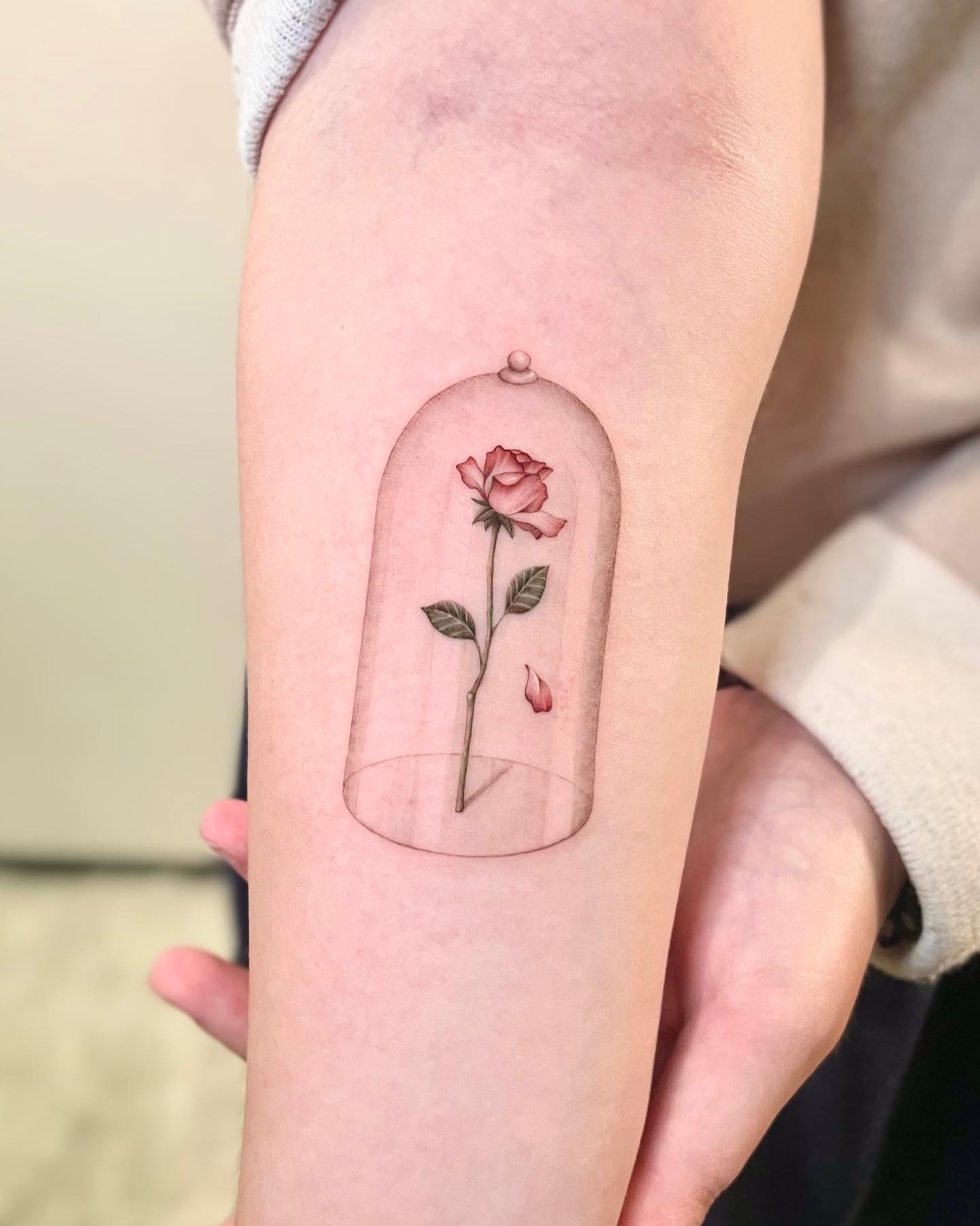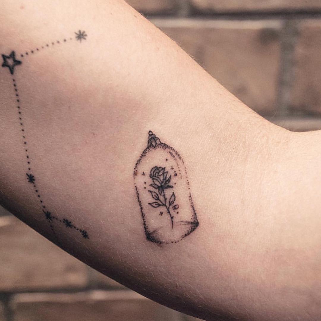 Minimalist Beauty and the Beast Rose Tattoo in a Glass Dome