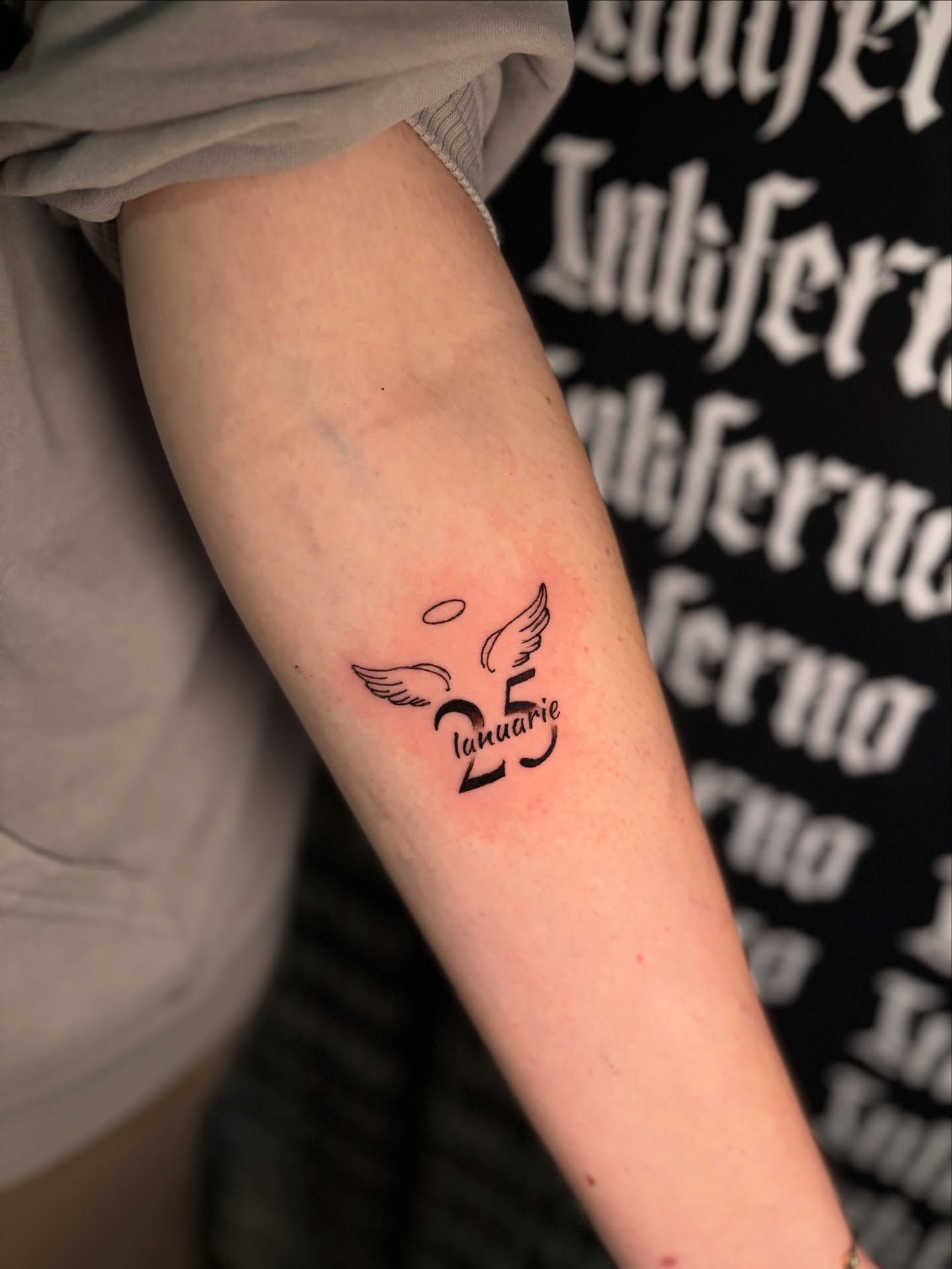 This meaningful date tattoo is paired with delicate angel wings and a small halo floating above, creating a powerful symbol of love and remembrance.