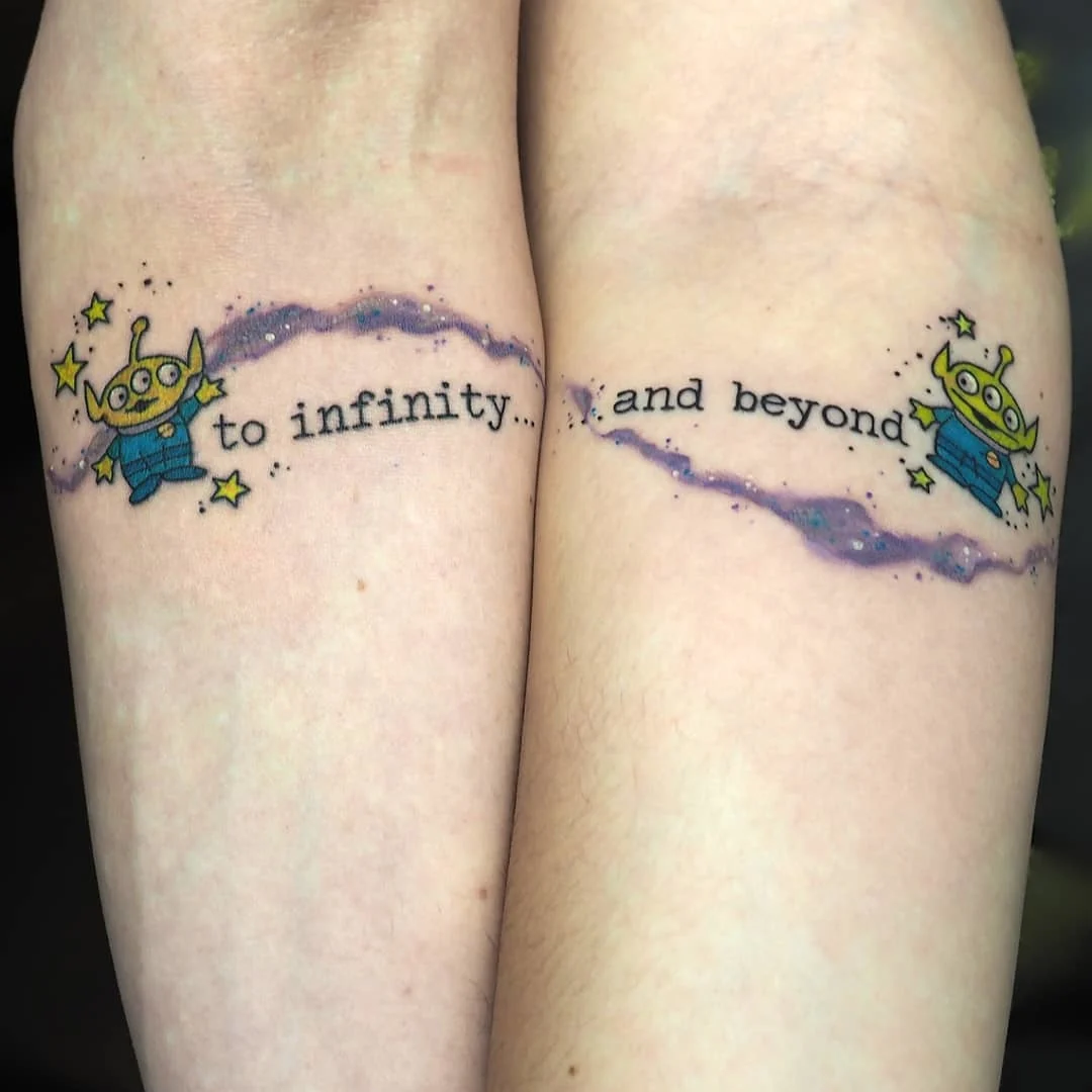This colorful matching tattoo uses the Toy Story aliens to frame the iconic phrase “to infinity… and beyond.”