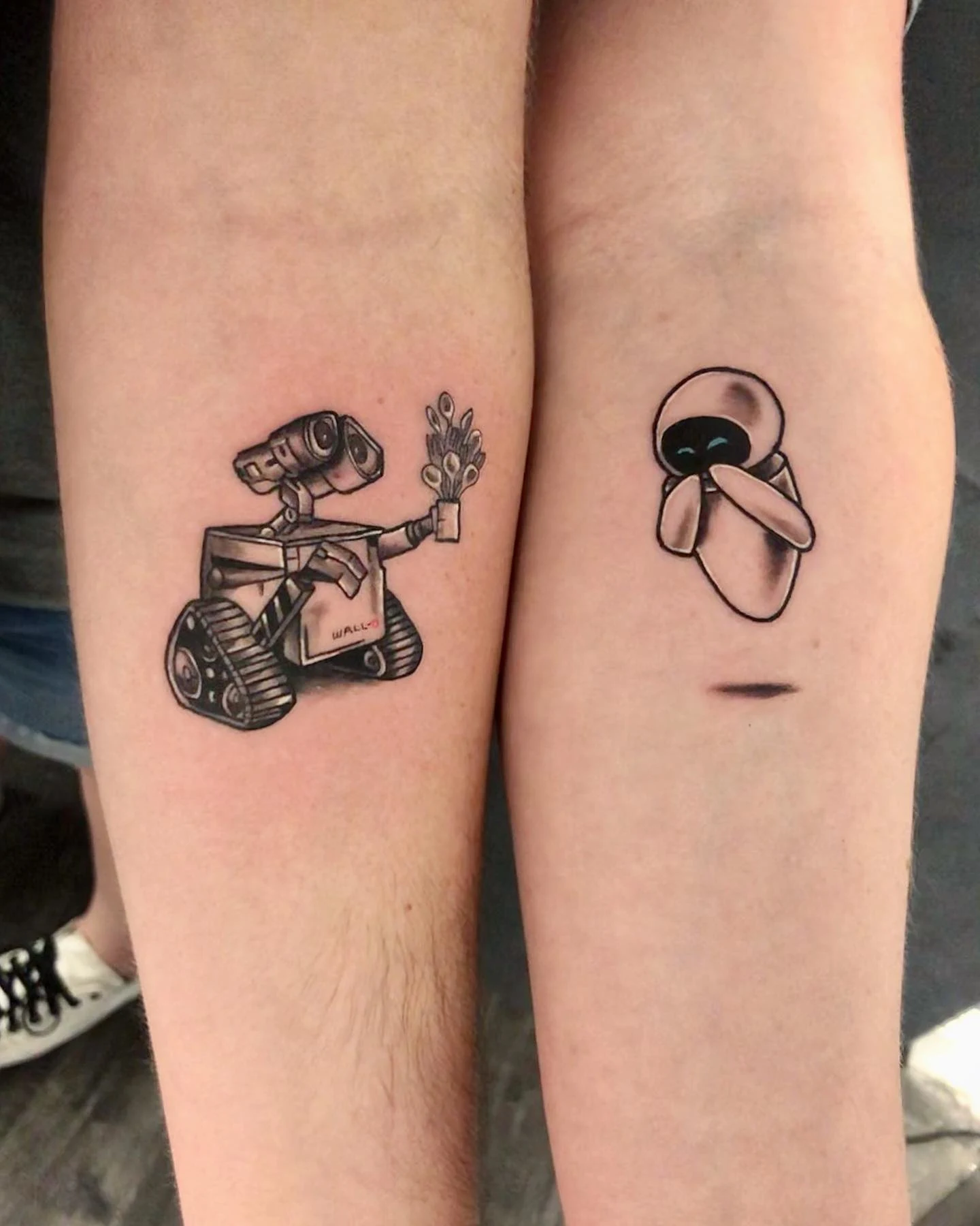 This minimalist tattoo pair captures WALL-E and EVE using clean, continuous lines that keep the design simple and expressive.