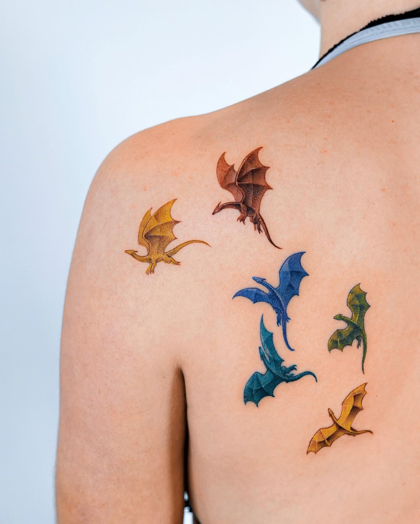 The variation in shades creates visual interest while keeping the overall design light and balanced. Clean outlines and soft shading help each dragon stand out without overwhelming the skin.