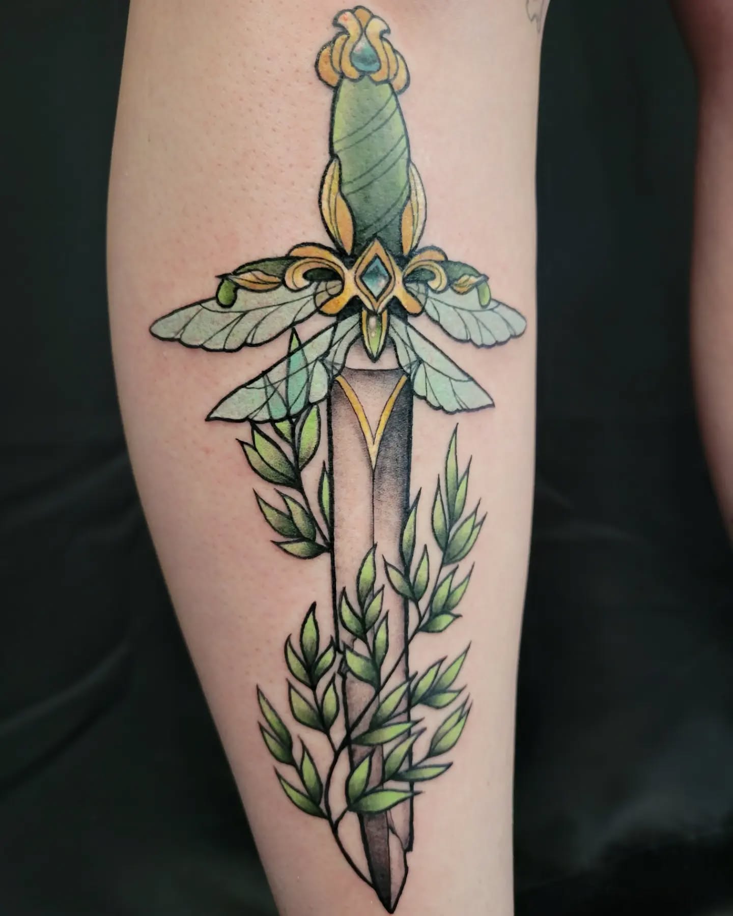The dagger stands tall and centered, detailed with muted greens and warm gold accents that feel earthy and refined.