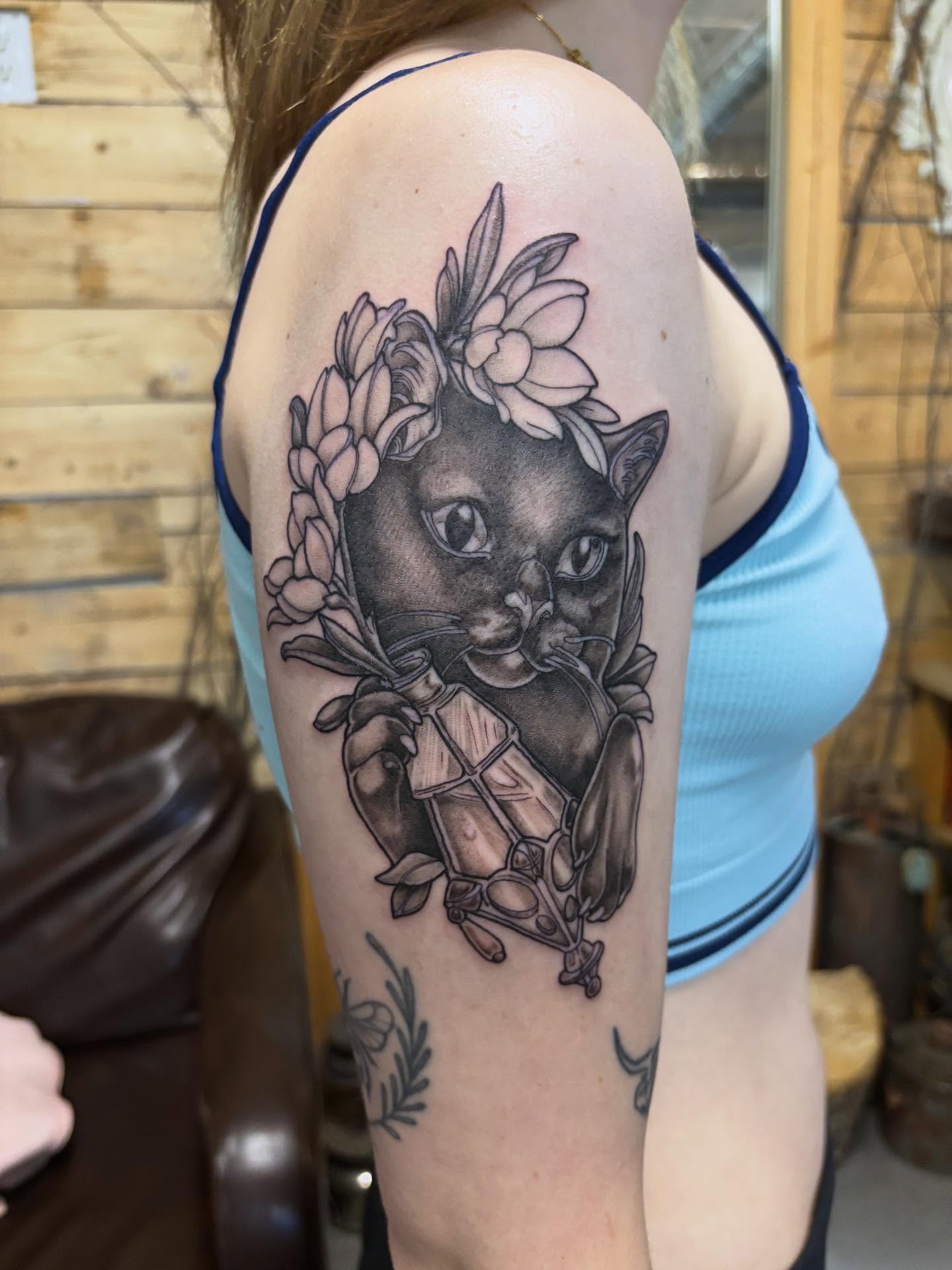 Cat with Flowers Earthy Tattoo