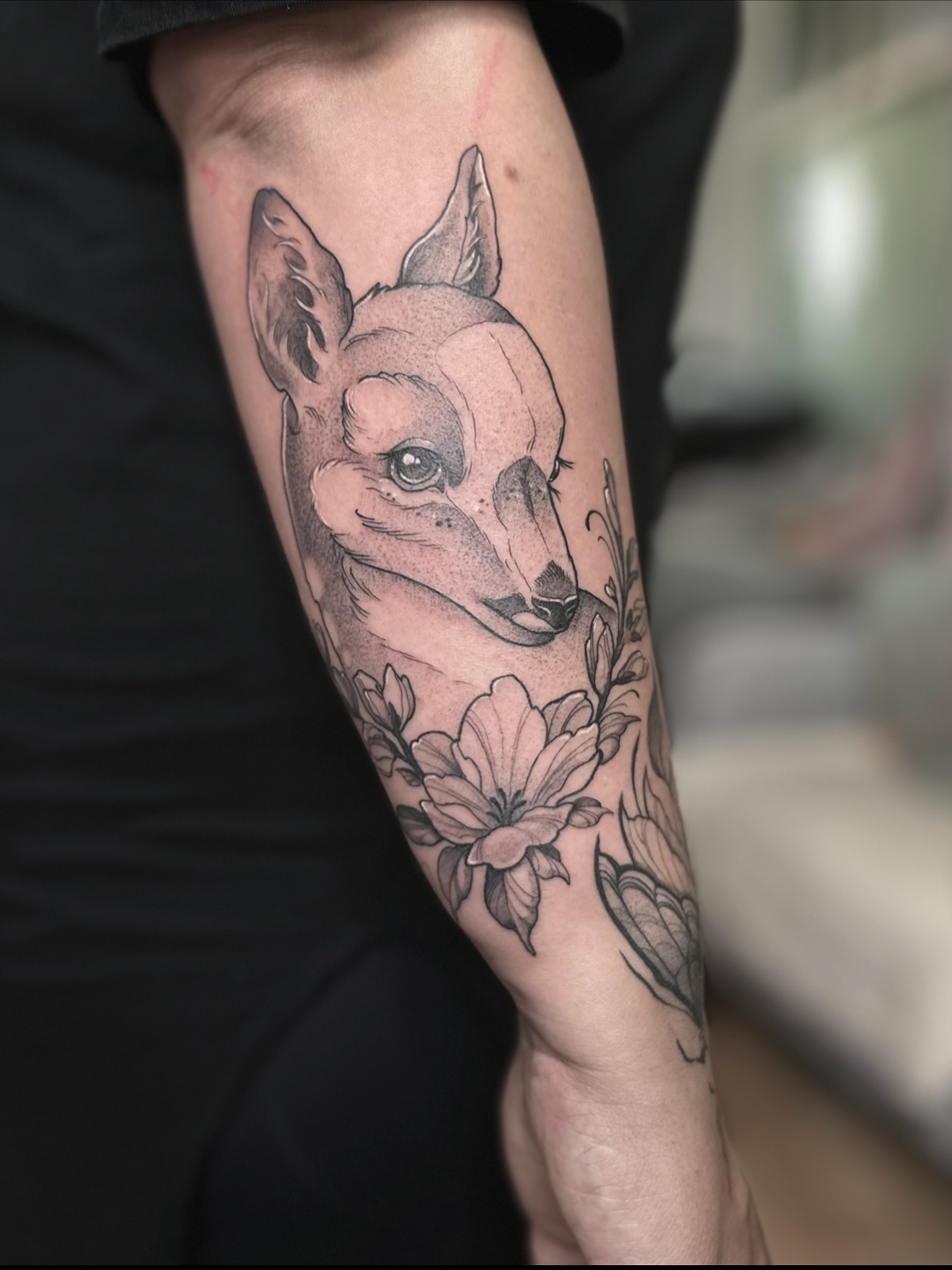 This deer and wildflower tattoo captures quiet woodland beauty through soft shading and gentle detail.