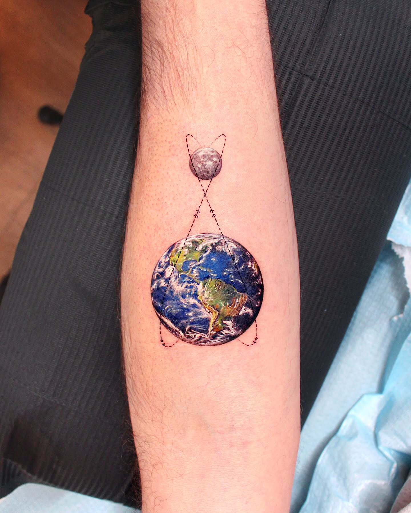 This Earth and Moon tattoo blends realism with fine line geometry for a grounded, thoughtful design.
