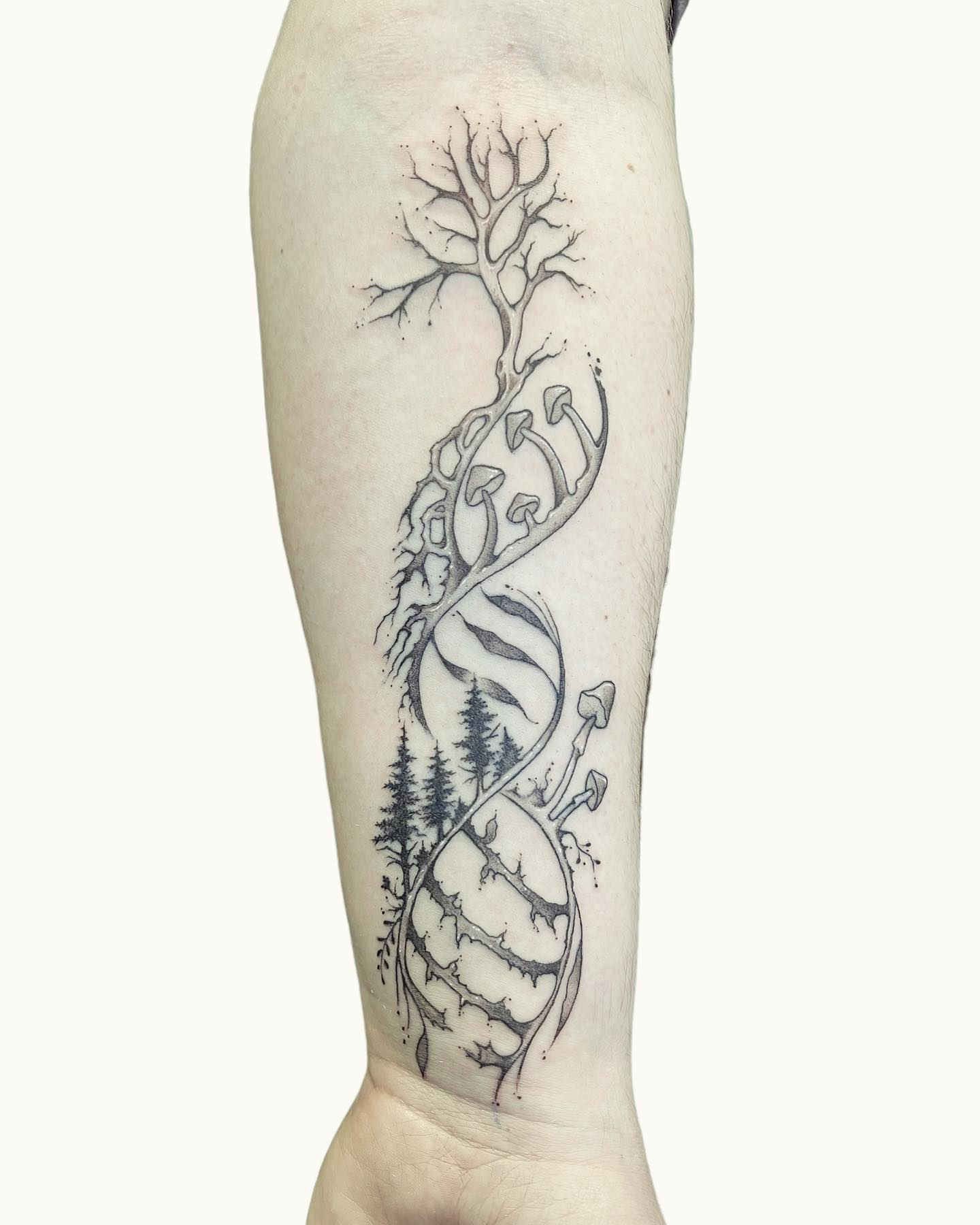 This earthy DNA strand tattoo blends science and nature into a flowing, meaningful design.