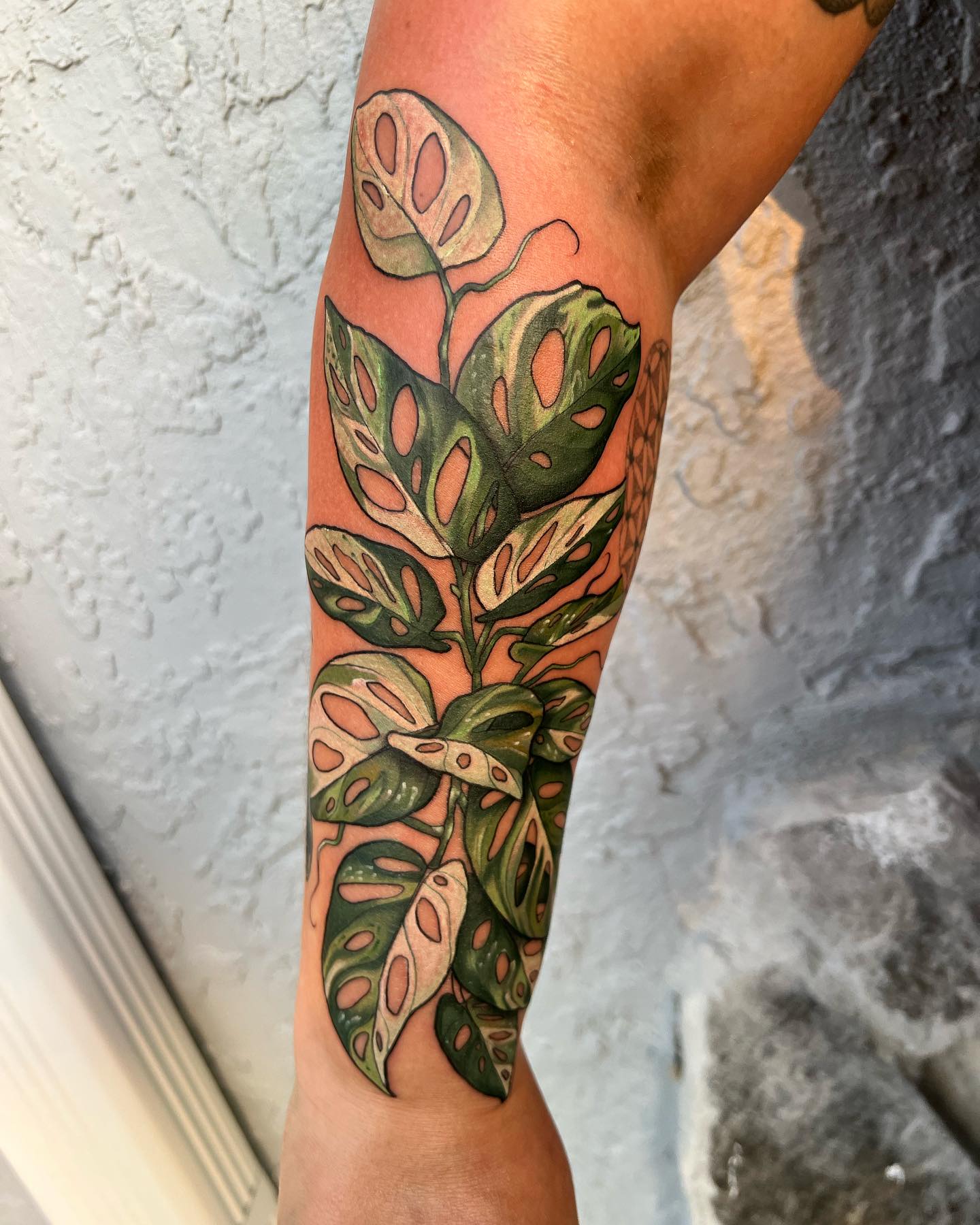 This monstera leaf tattoo celebrates lush plant life with rich greens and soft, natural shading.