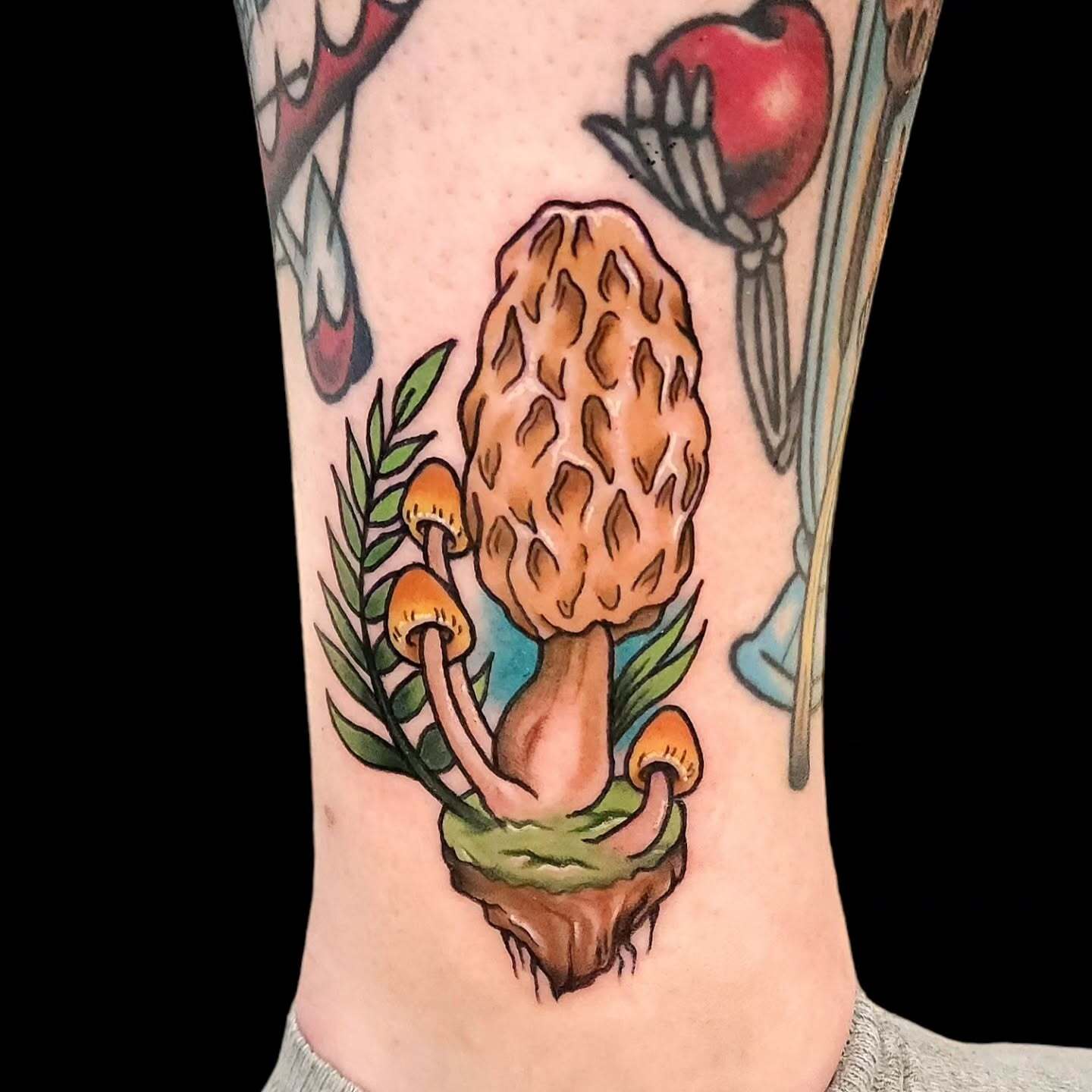This earthy tattoo features a detailed morel mushroom growing from a small patch of soil, surrounded by soft greenery.
