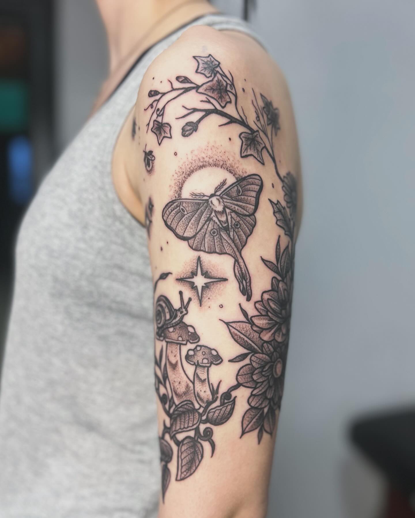 This moth and woodland tattoo brings together night creatures, plants, and forest details in a calm, earthy composition.