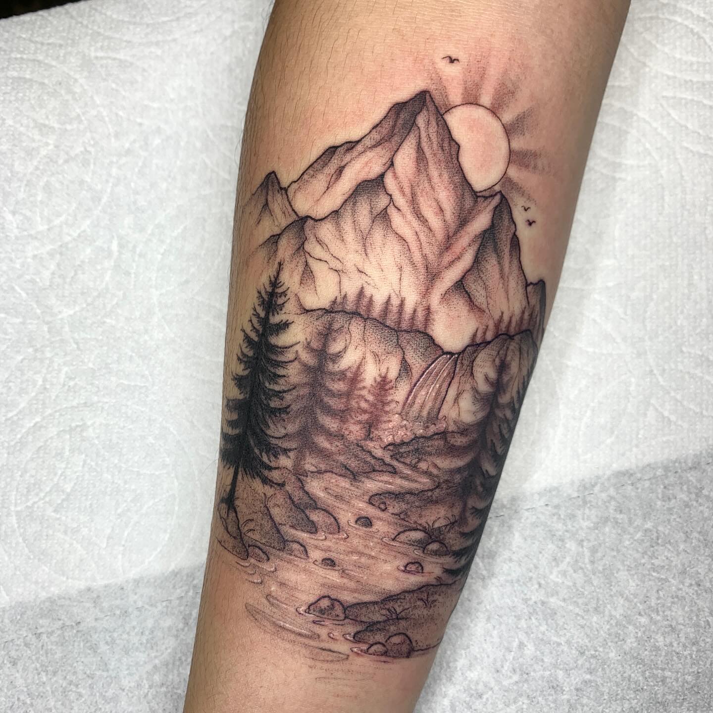 This mountain landscape tattoo captures a quiet moment in nature with soft shading and flowing linework.