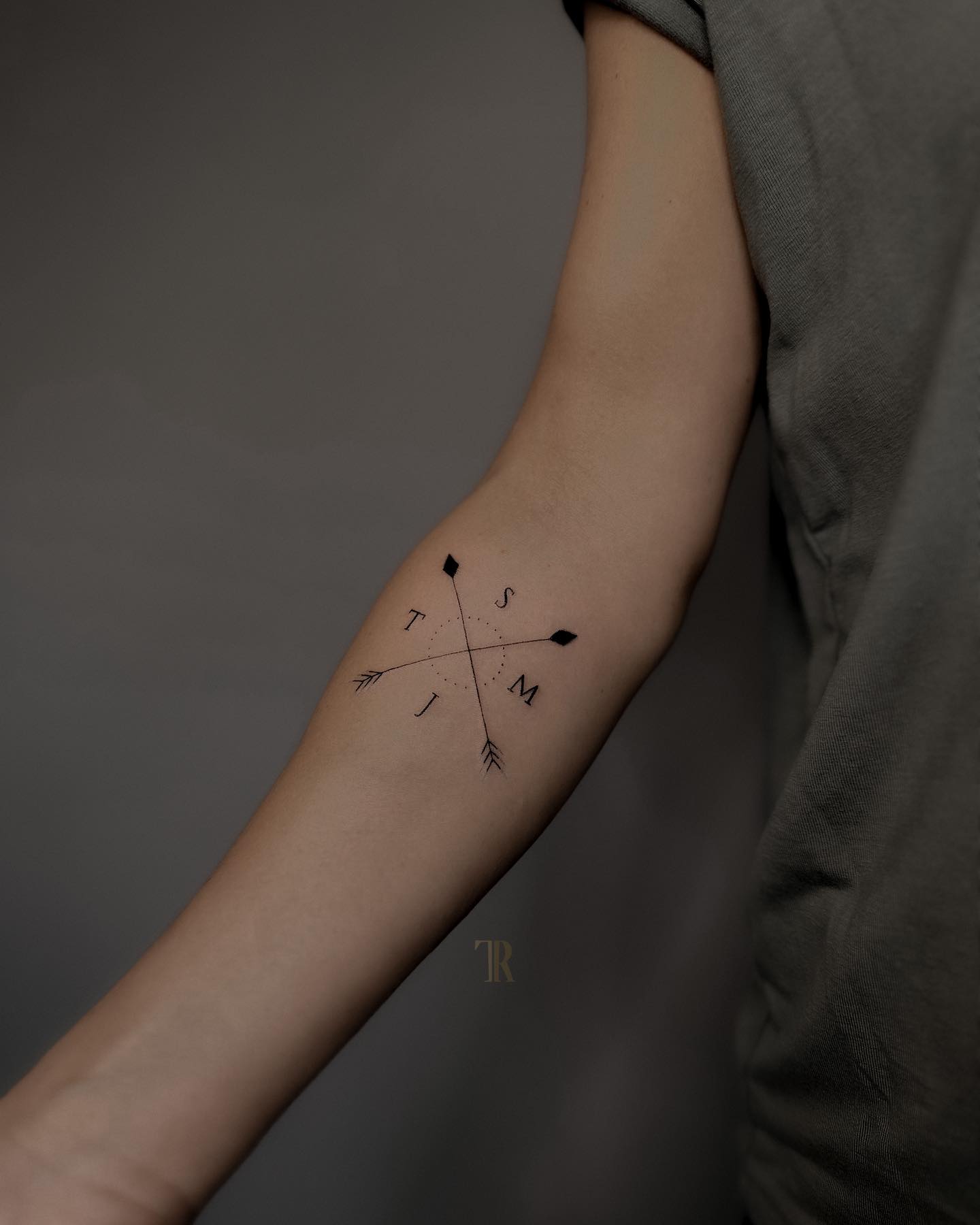 The initials S, T, J, and M sit around the arrows, and each letter represents someone important. The arrows point in opposite directions, which suggests protection, connection, and shared strength. Light dotted details add softness without taking attention from the main lines.