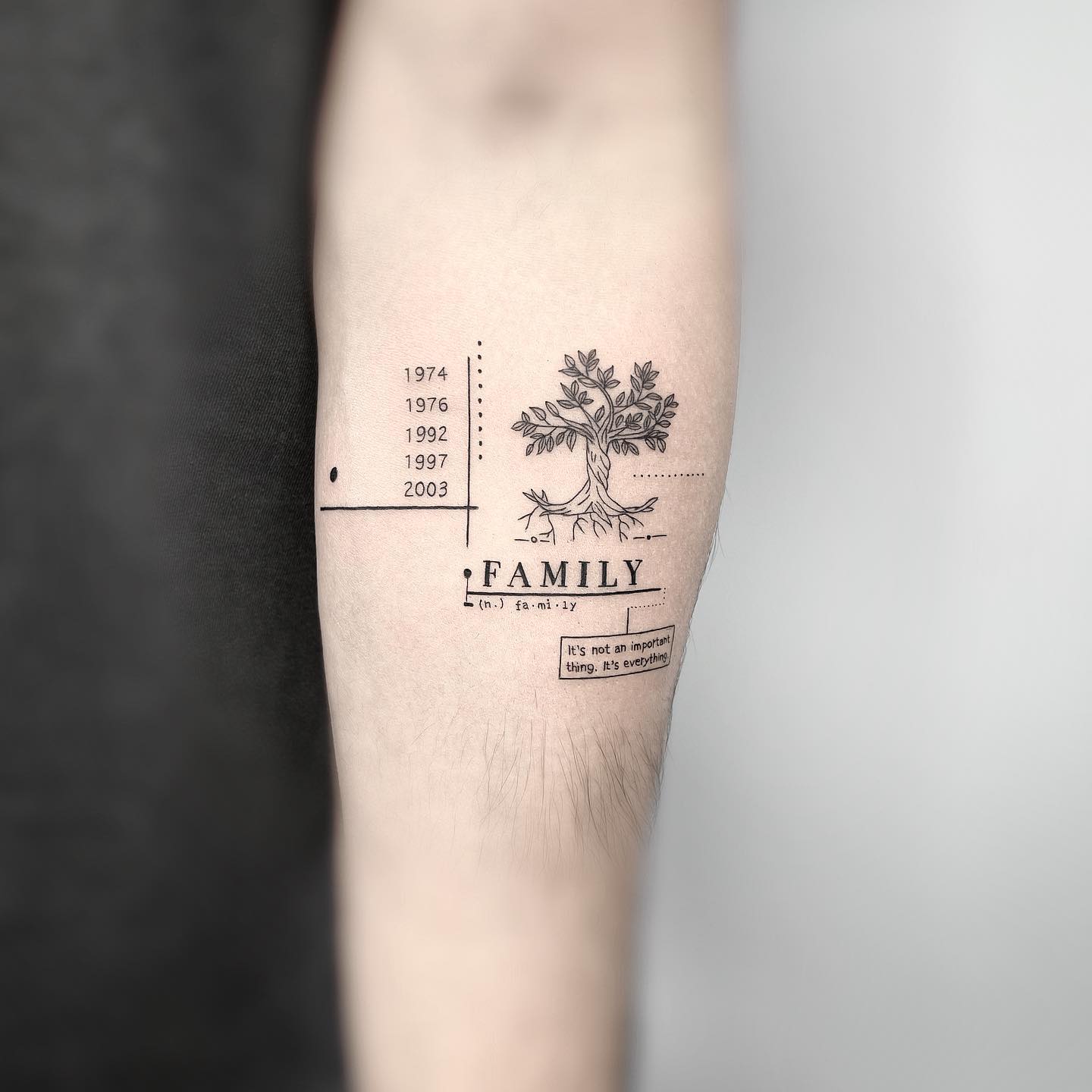 This tattoo blends a family timeline with a small, detailed tree to show how roots and years connect.