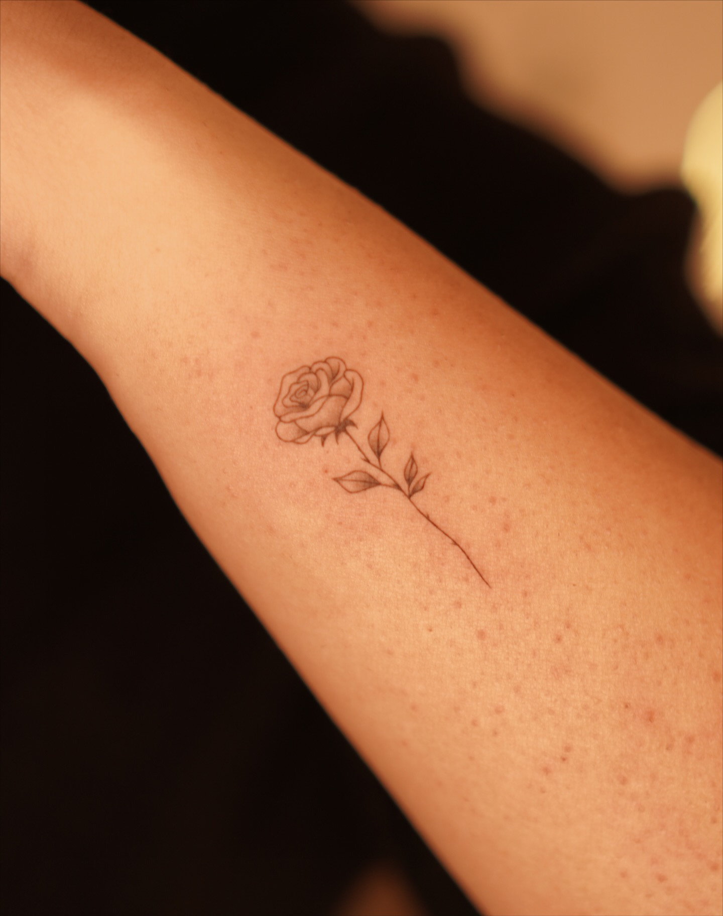 This fine line rose tattoo uses soft strokes to create a calm and balanced design.