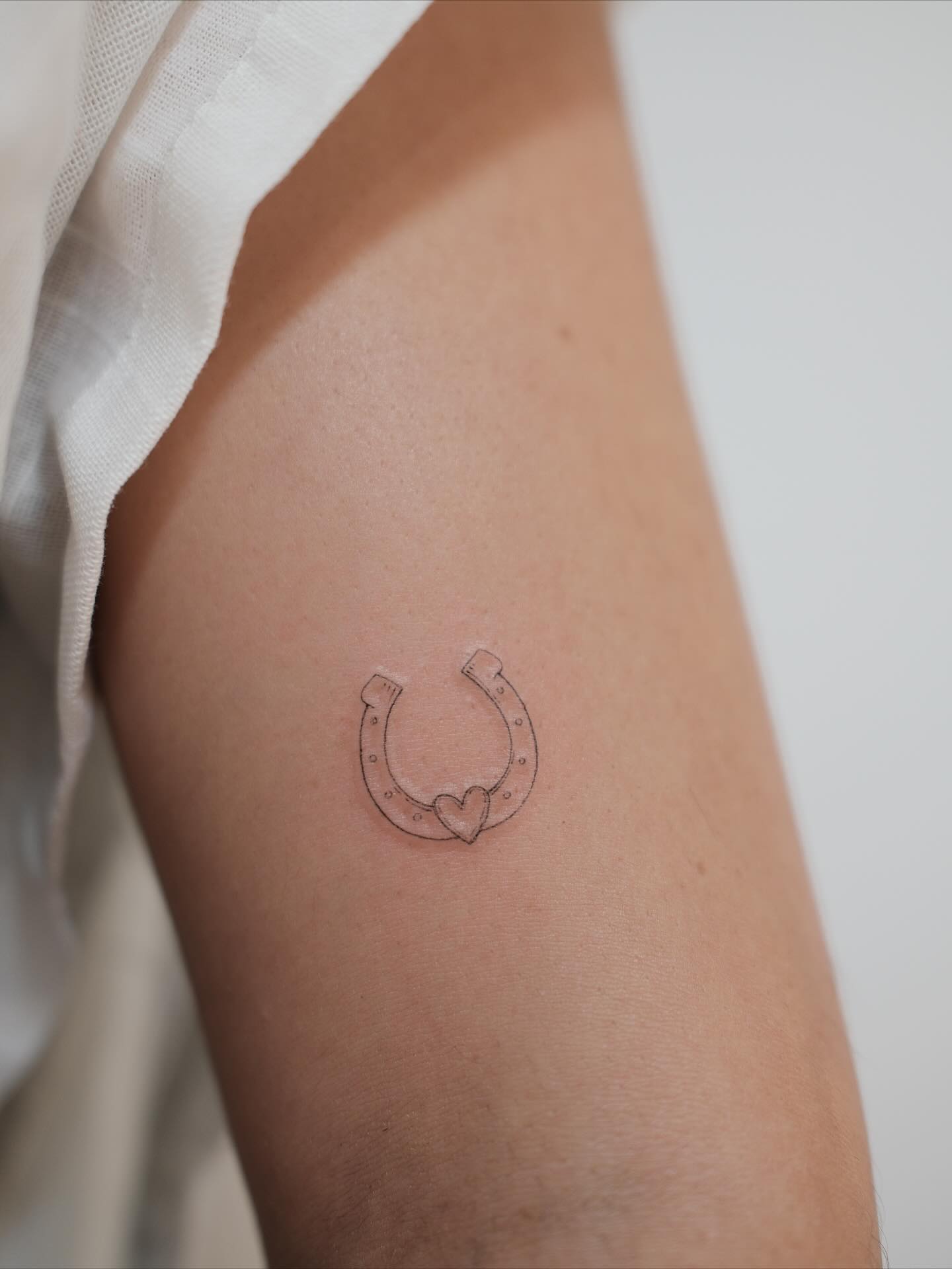 The outline stays light and steady, giving the piece a clean look that fits well on the upper arm. Small dots along the horseshoe add texture without making the tattoo feel busy. The gentle curve of the shape keeps the design soft and welcoming.