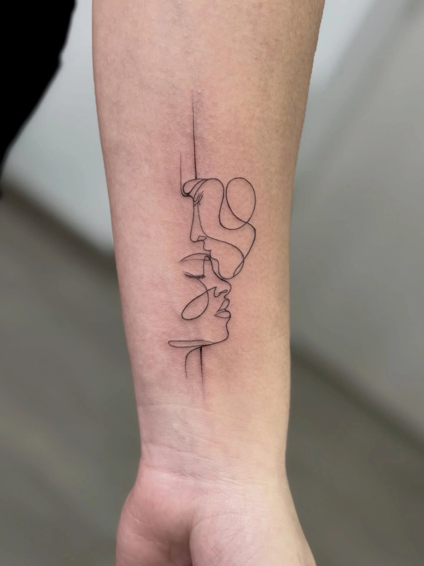 This fine line tattoo uses a single continuous outline to form two abstract faces meeting in a calm, balanced composition.