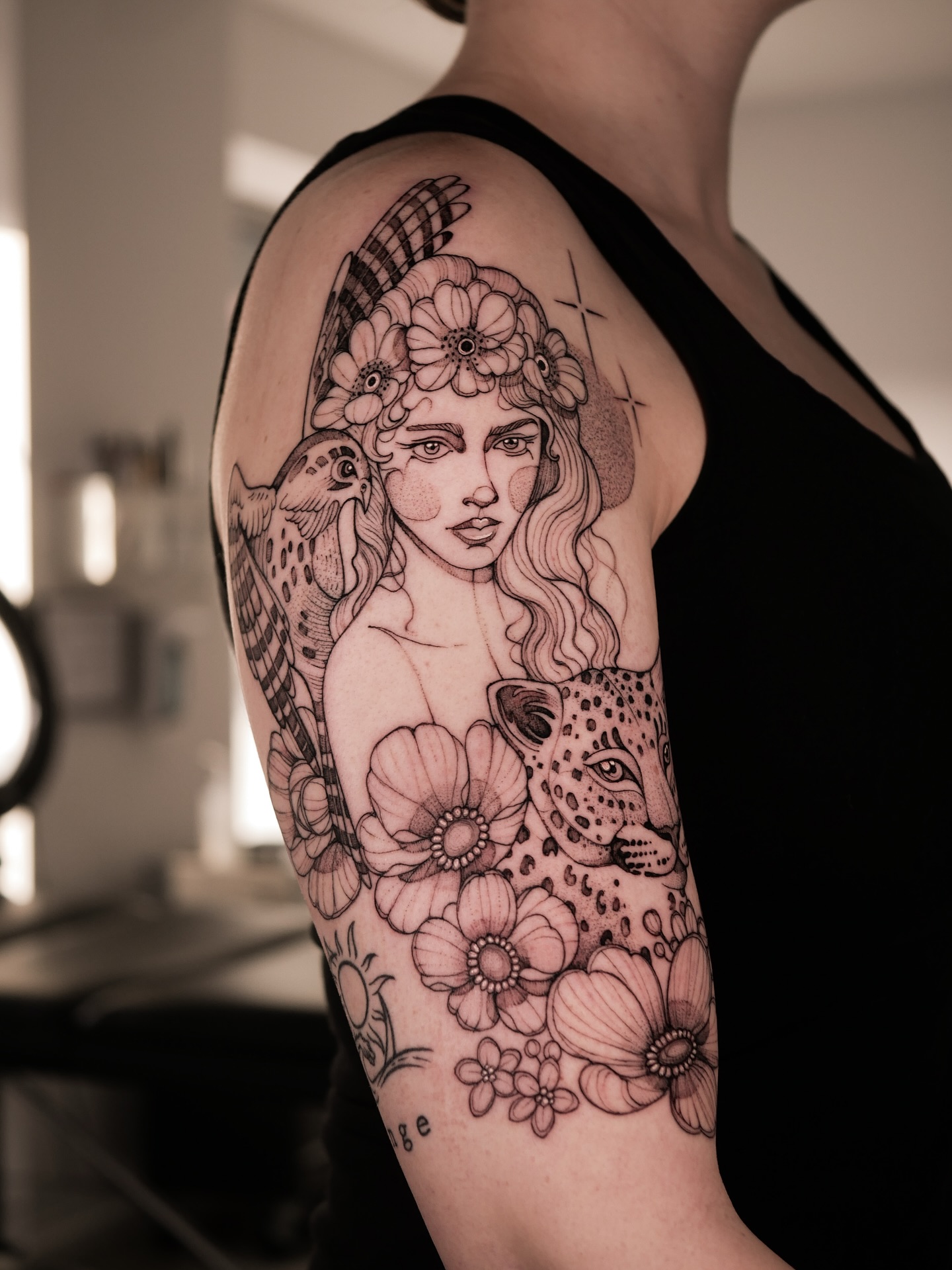 This tattoo feels symbolic and expressive, perfect for someone drawn to feminine energy, inner strength, and nature inspired storytelling.