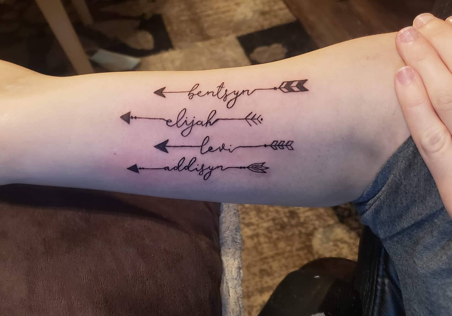 This bold kids name tattoo features multiple arrows aligned across the forearm, each paired with a handwritten name.