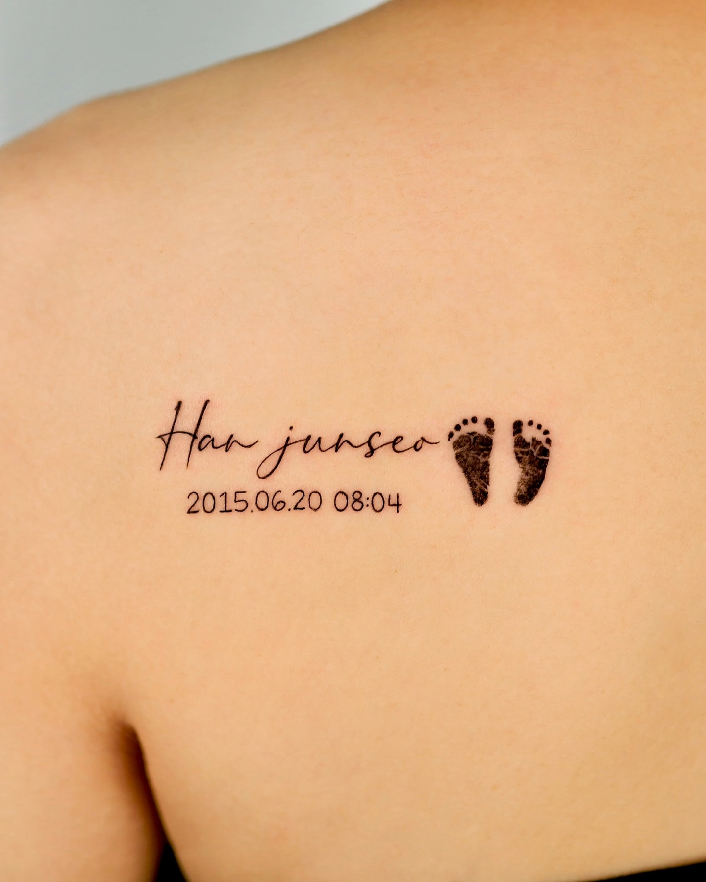 This tattoo combines a child’s name, birth details, and tiny footprints to create a clear and heartfelt tribute.