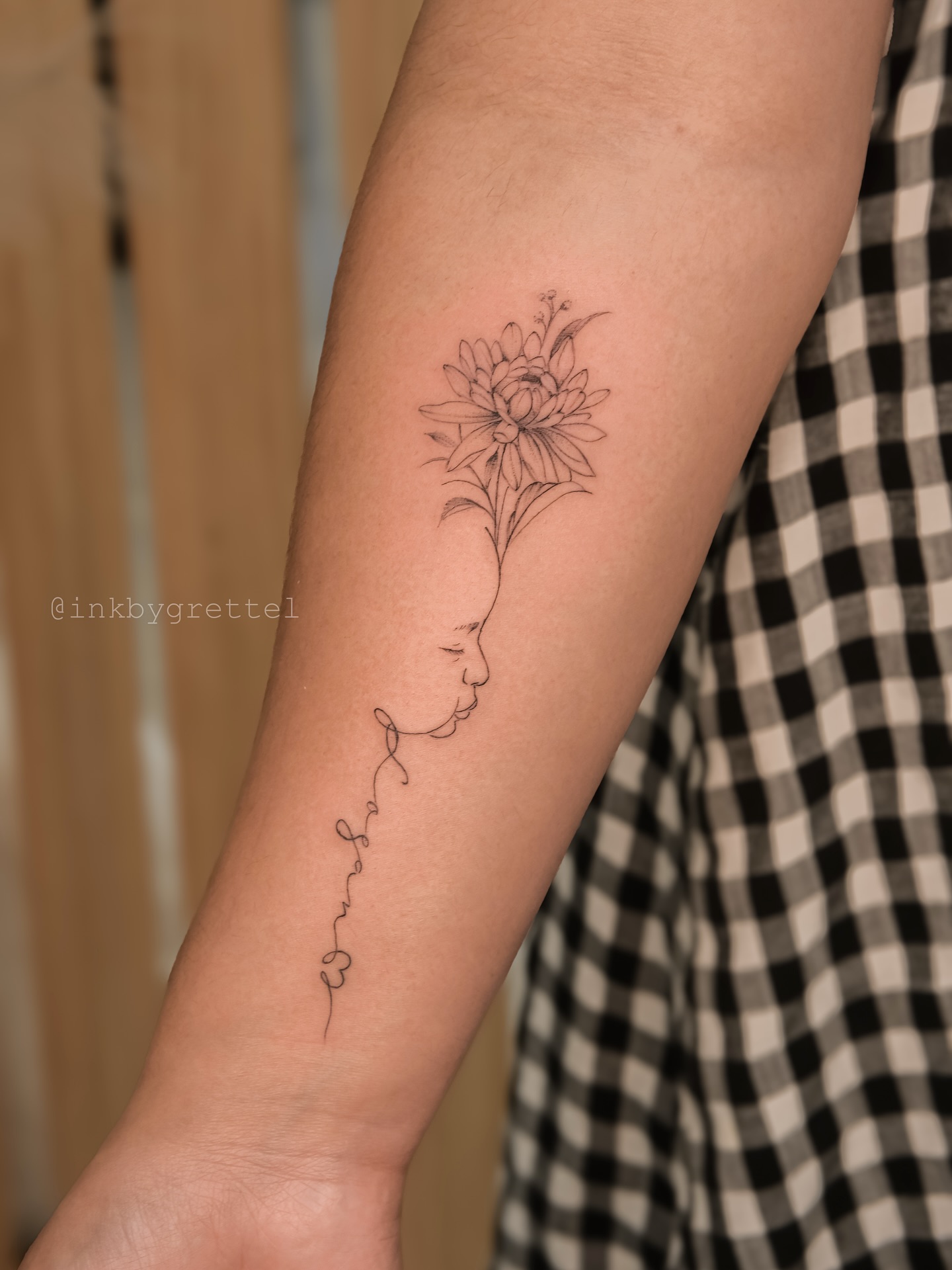 The flower sits at the top of the forearm, and its stem flows down into the outline of a baby’s face.