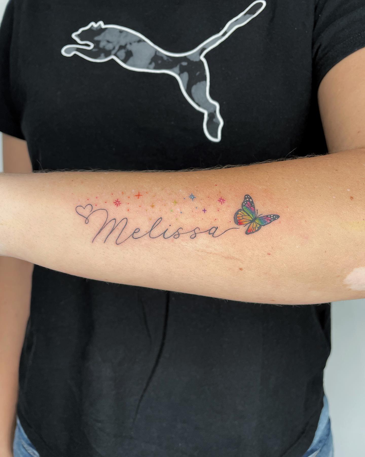 This colorful kids name tattoo features a flowing handwritten name paired with a vibrant butterfly and soft sparkle accents.
