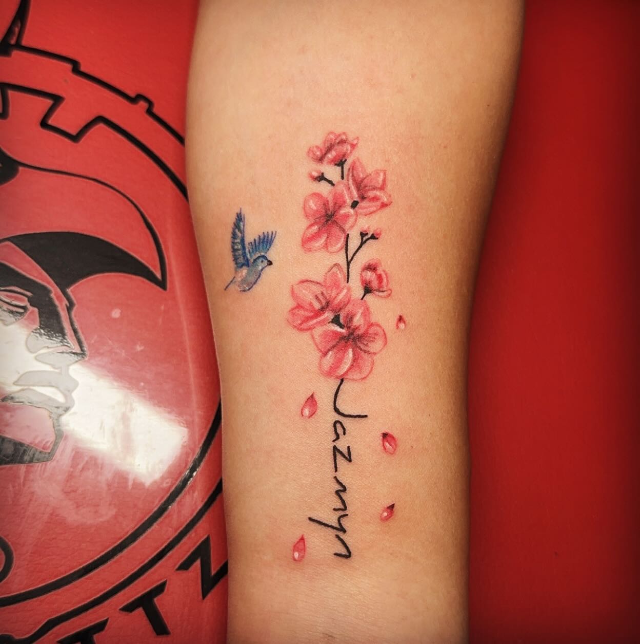 Cherry Blossom and Bird Kids Name Tattoo