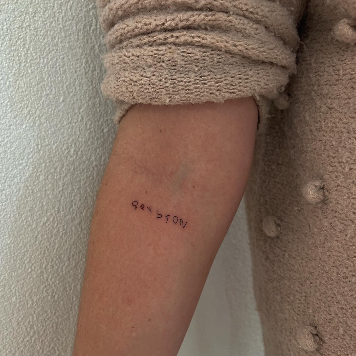 The slightly uneven lettering keeps the design authentic, capturing a moment in time exactly as it was written. Placed on the inner arm, the tattoo feels quiet, intimate, and emotionally close.