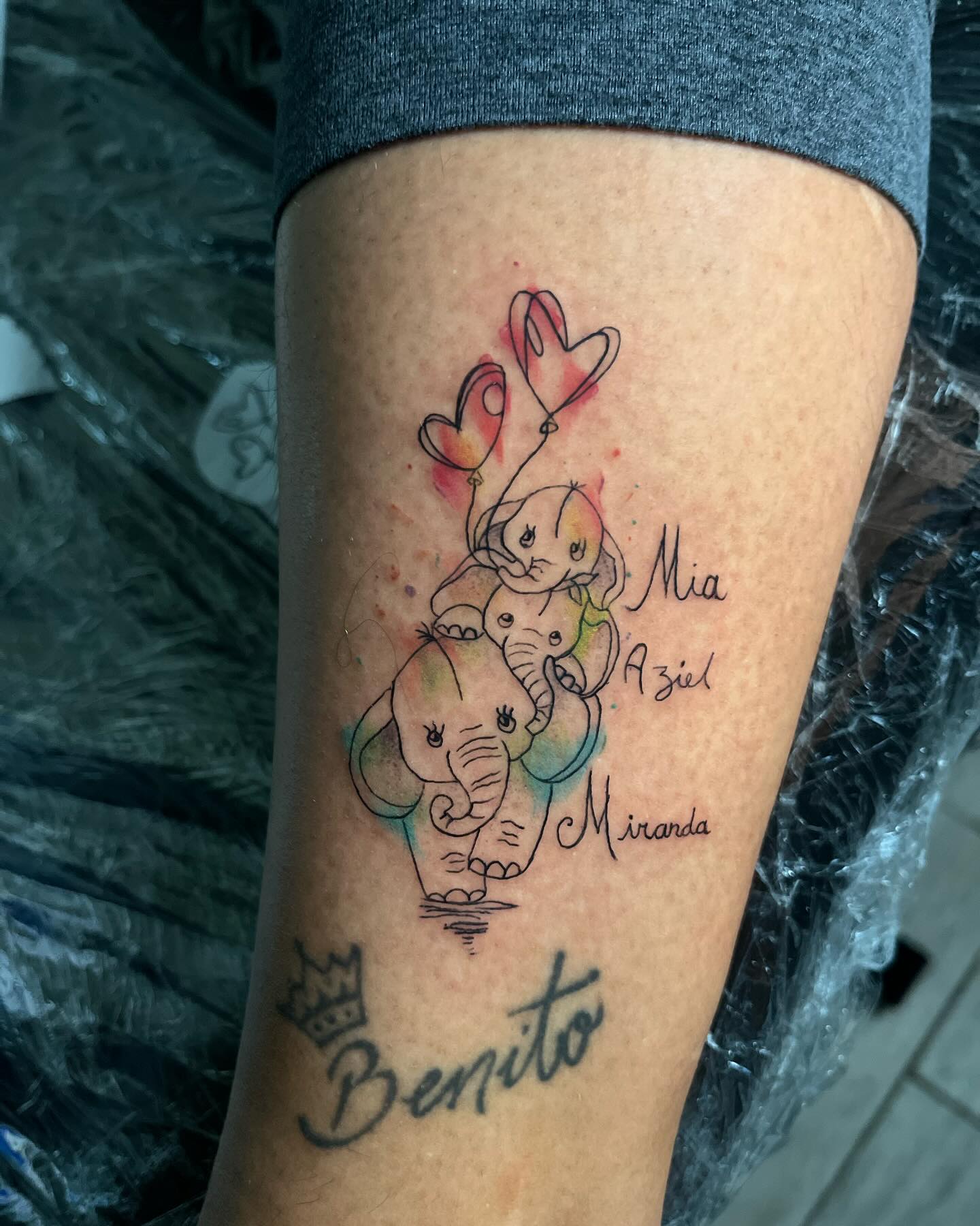 This charming kids name tattoo features a stacked elephant family illustrated in soft linework, creating a playful yet emotional design.