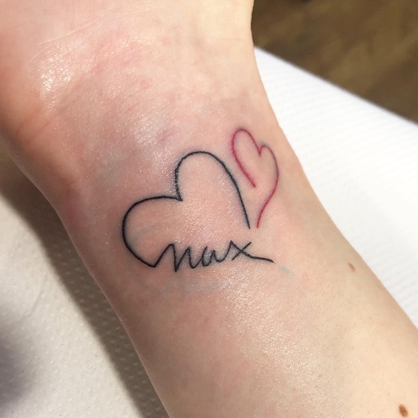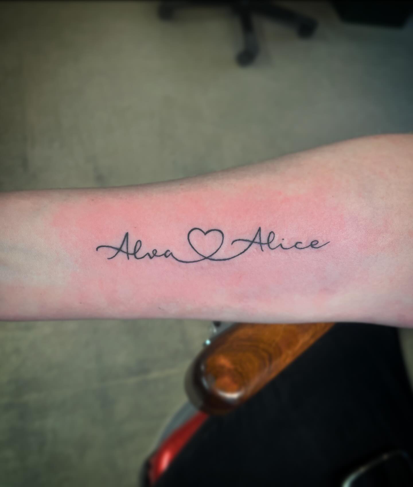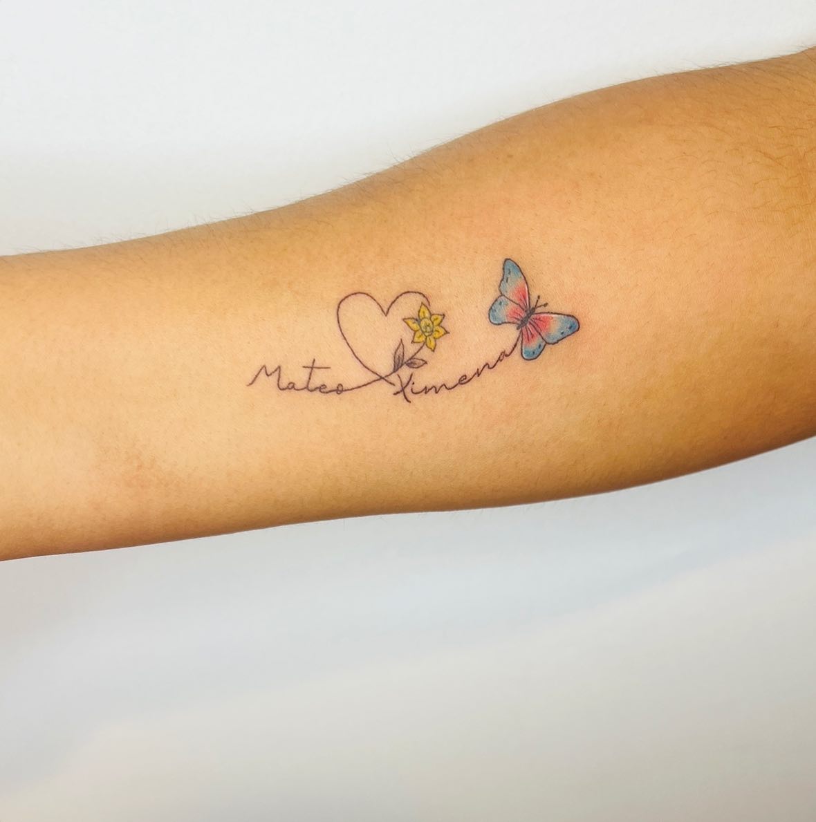 Placed along the forearm, the design feels personal, gently visible enough for daily loving reminders.