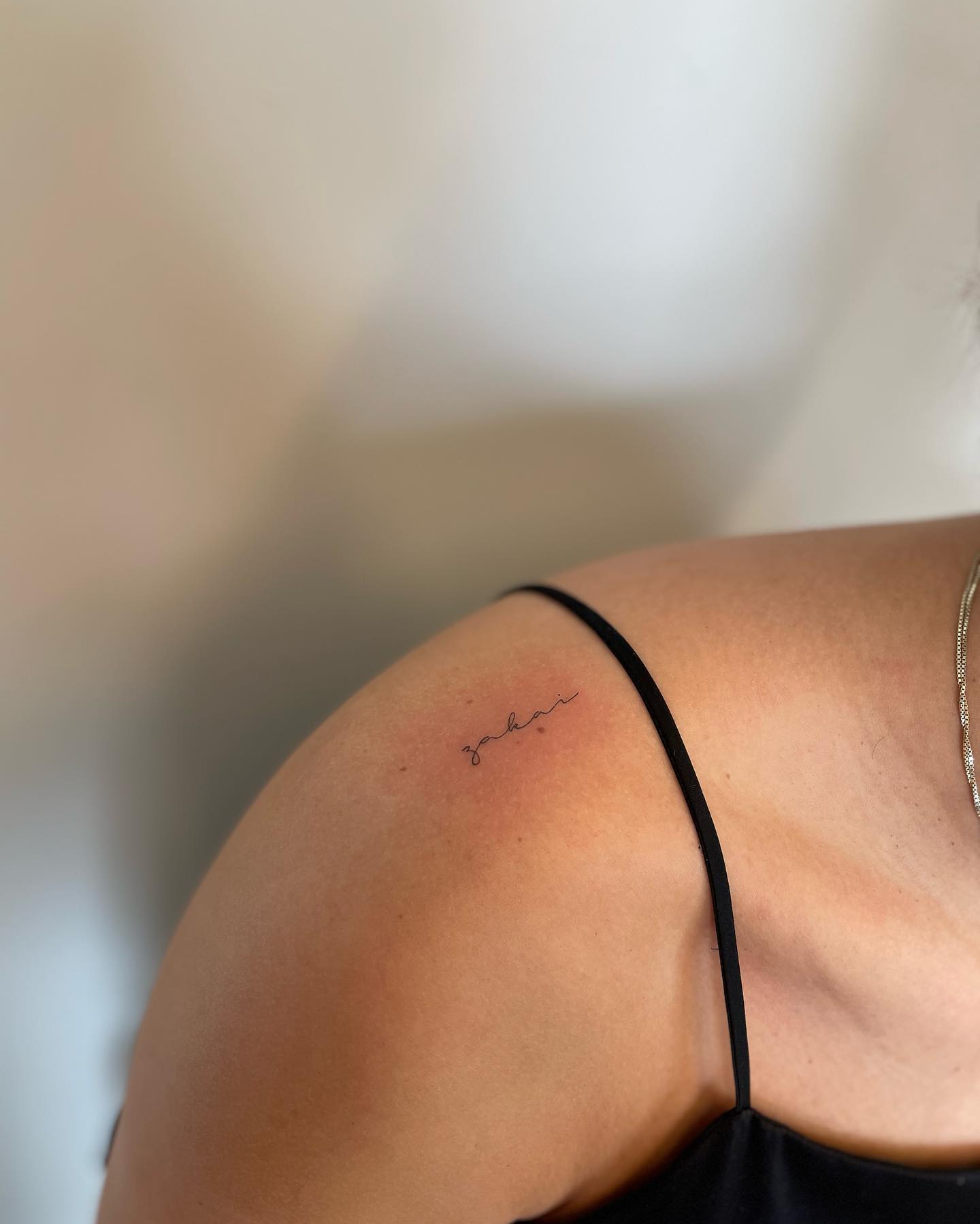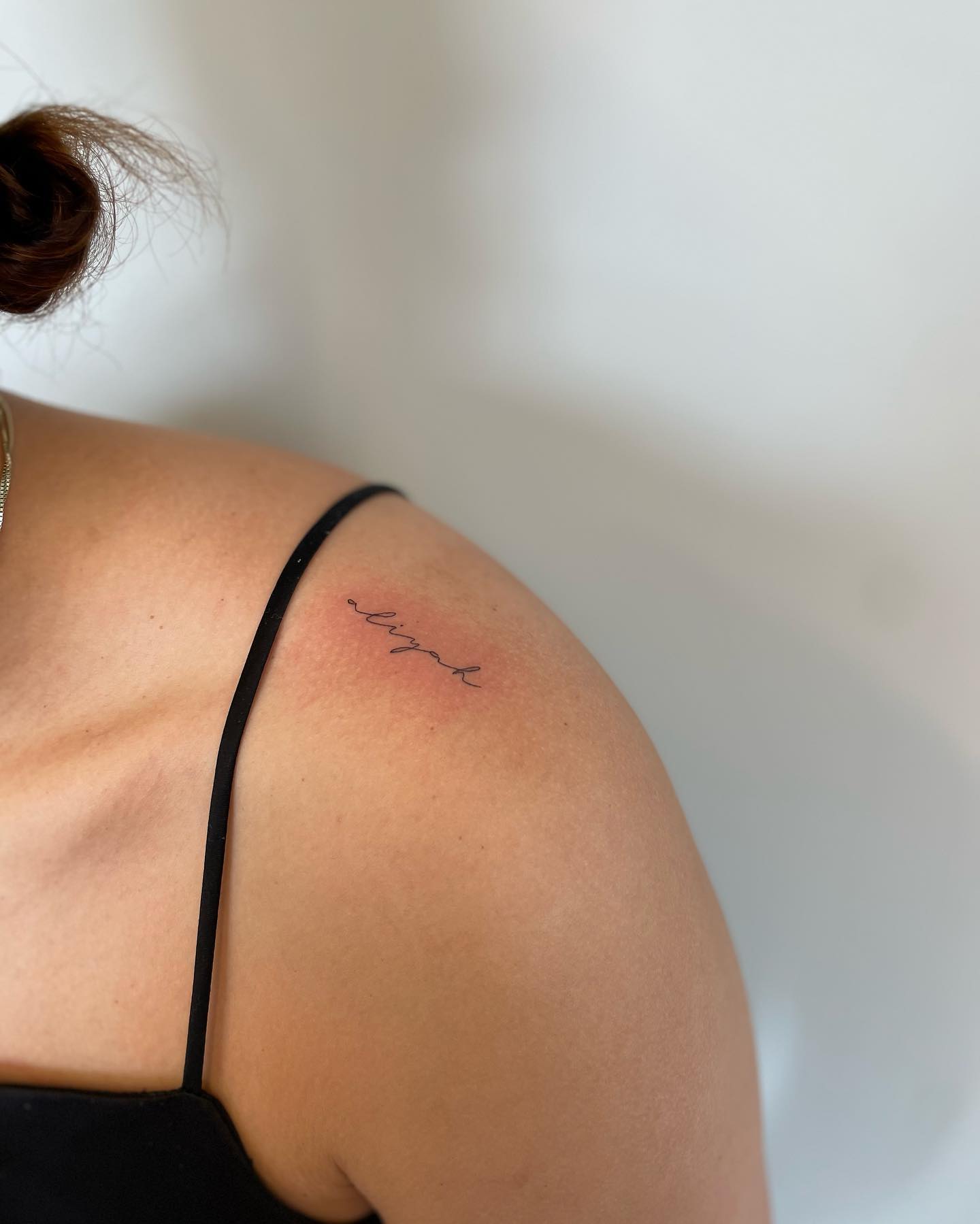 Positioned near the collarbone and shoulder curve, the tattoos sit naturally with the body’s movement.