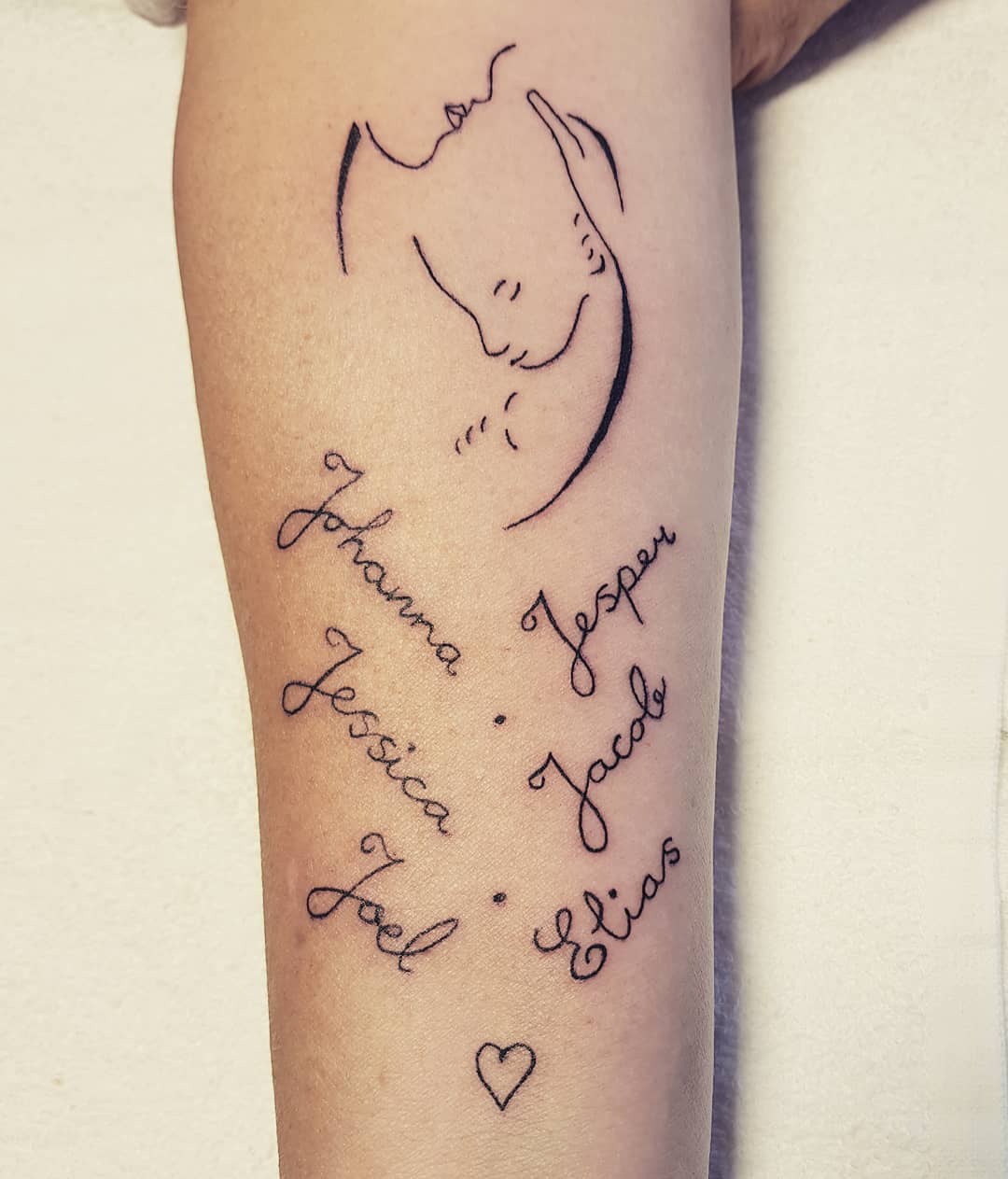 This heartfelt kids name tattoo features a minimalist line drawing of a mother gently cradling a child, placed above vertically arranged handwritten names.