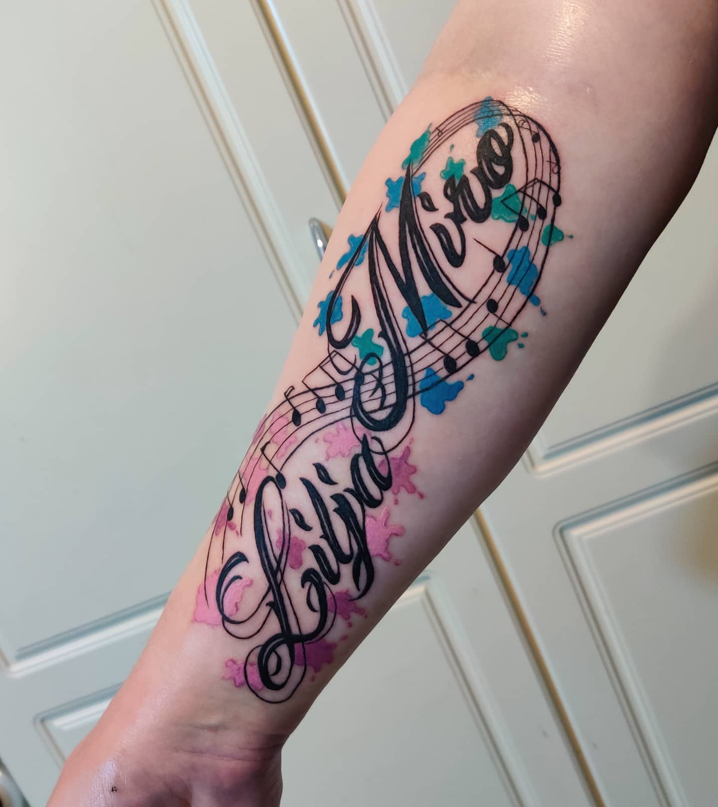 This expressive kids name tattoo blends flowing script names into a musical staff that wraps naturally along the forearm.