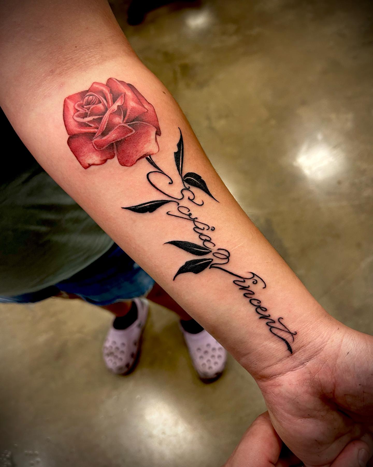 Placed along the forearm, the design feels open, expressive, and easy to admire daily. The fine script keeps the name personal without overpowering the artwork.