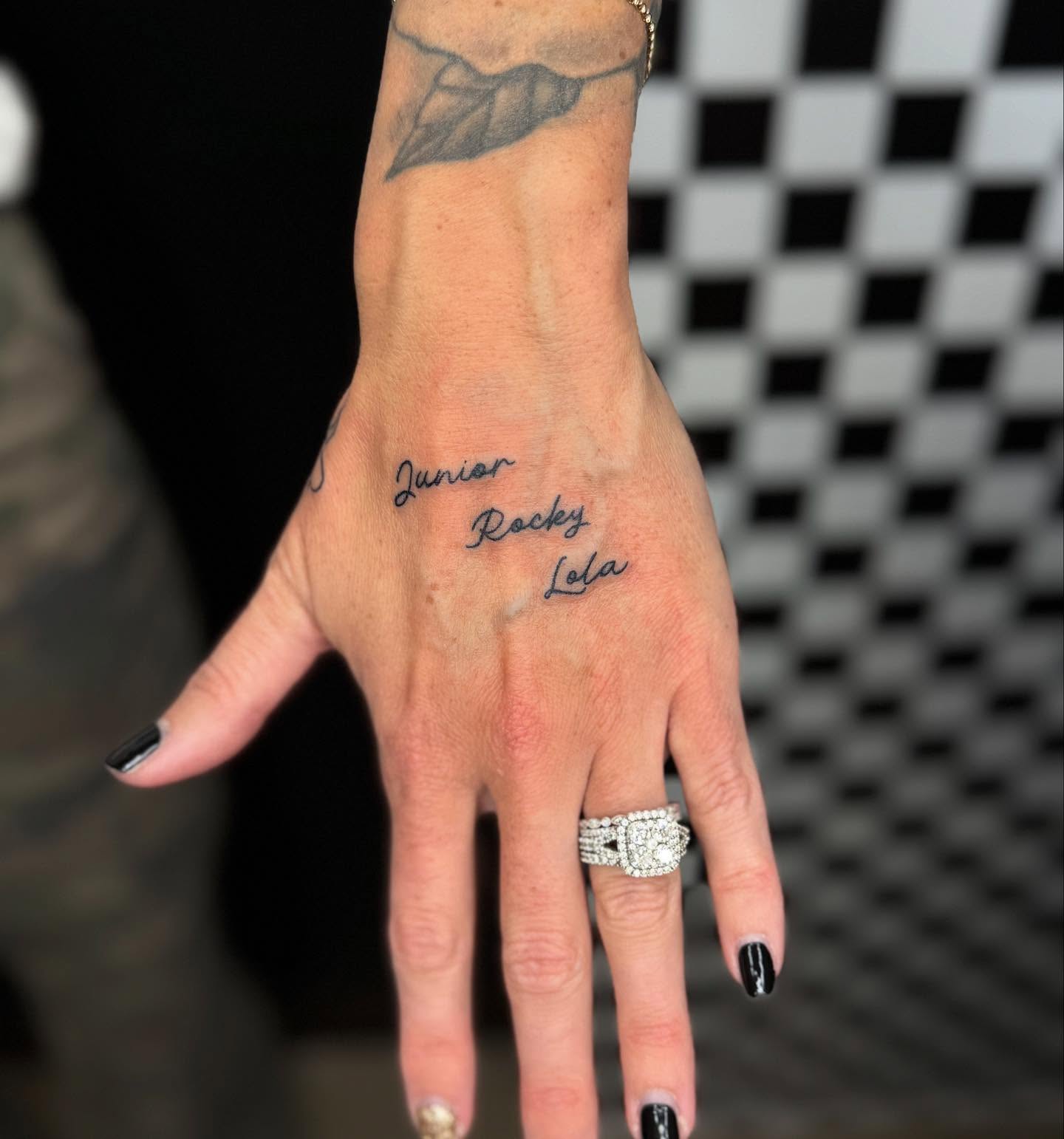 Positioned where it’s seen daily, the tattoo feels personal and grounding rather than decorative. The minimal style lets the names stand on their own without added elements.
