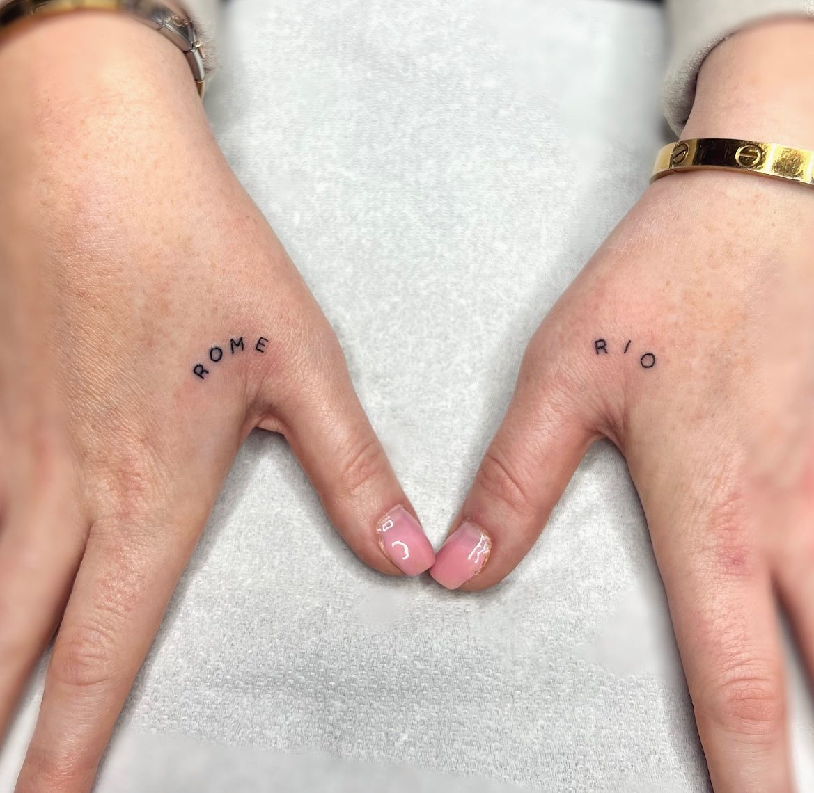 This minimal kids name tattoo features small lettering placed near the thumb area on each hand, creating a sweet and balanced design.