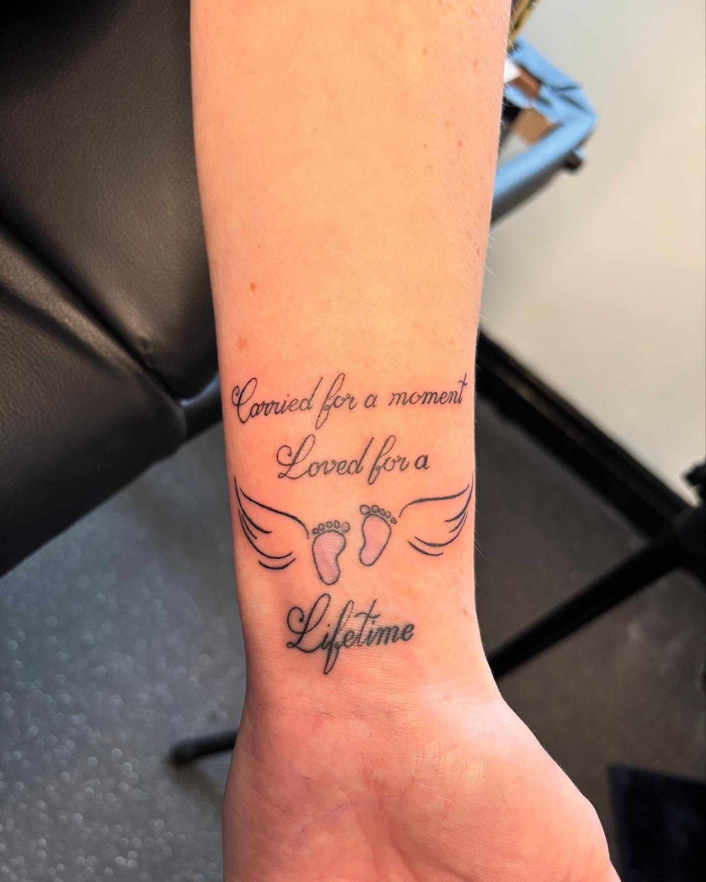 This miscarriage tattoo features a heartfelt quote paired with tiny baby footprints and delicate angel wings, symbolizing love that never fades.