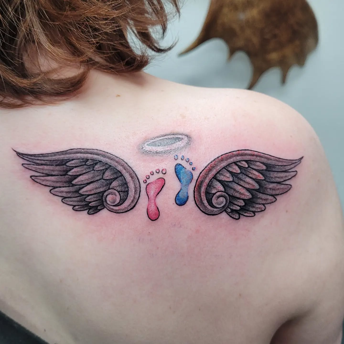 This miscarriage tattoo features a pair of detailed angel wings surrounding small baby footprints, symbolizing a child remembered as an angel.