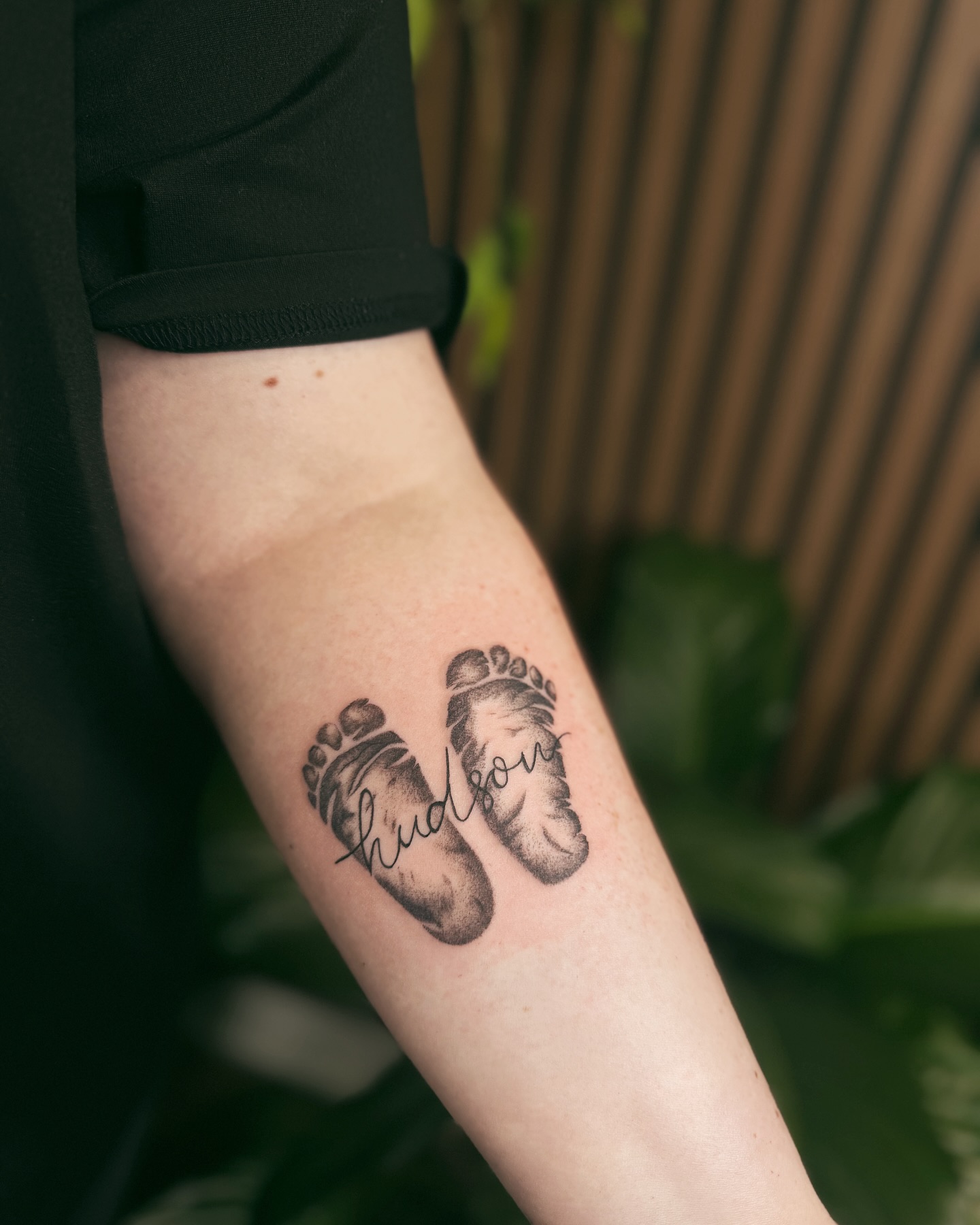 This miscarriage tattoo features two detailed baby footprints with the name Hudson written across them, symbolizing a deeply personal remembrance.
