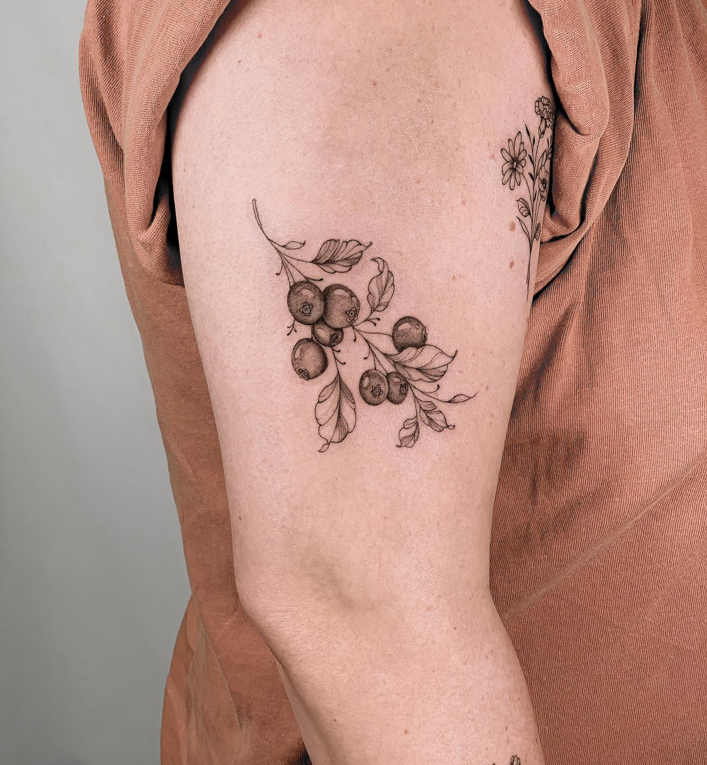 This miscarriage tattoo features a delicate branch holding seven blueberries, symbolizing a pregnancy remembered at seven weeks.