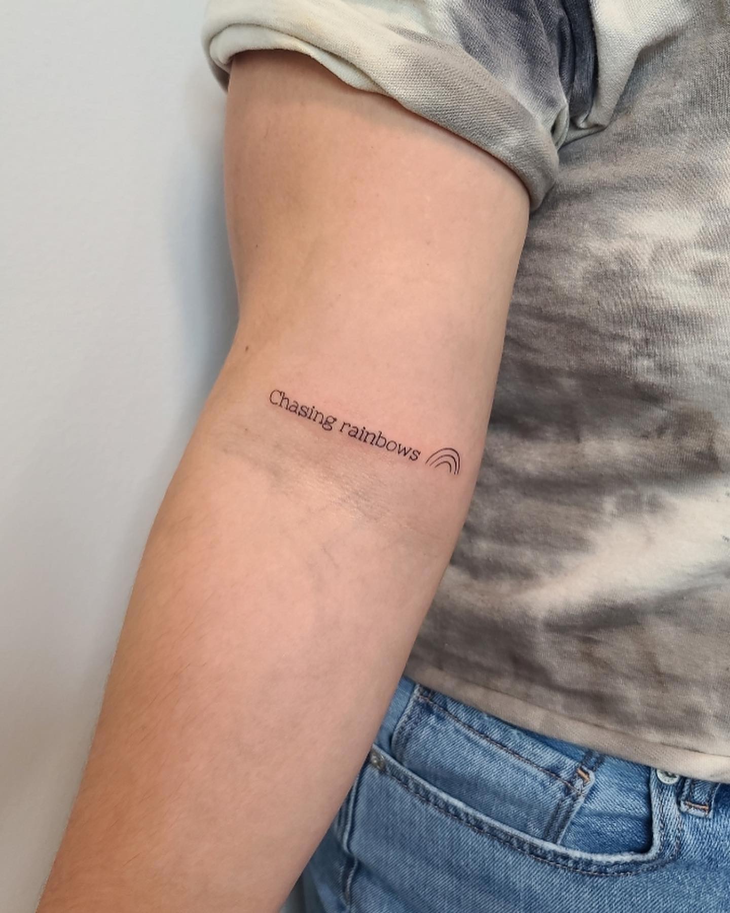 This miscarriage tattoo features the simple phrase chasing rainbows paired with a small rainbow symbol, representing hope and remembrance after loss.