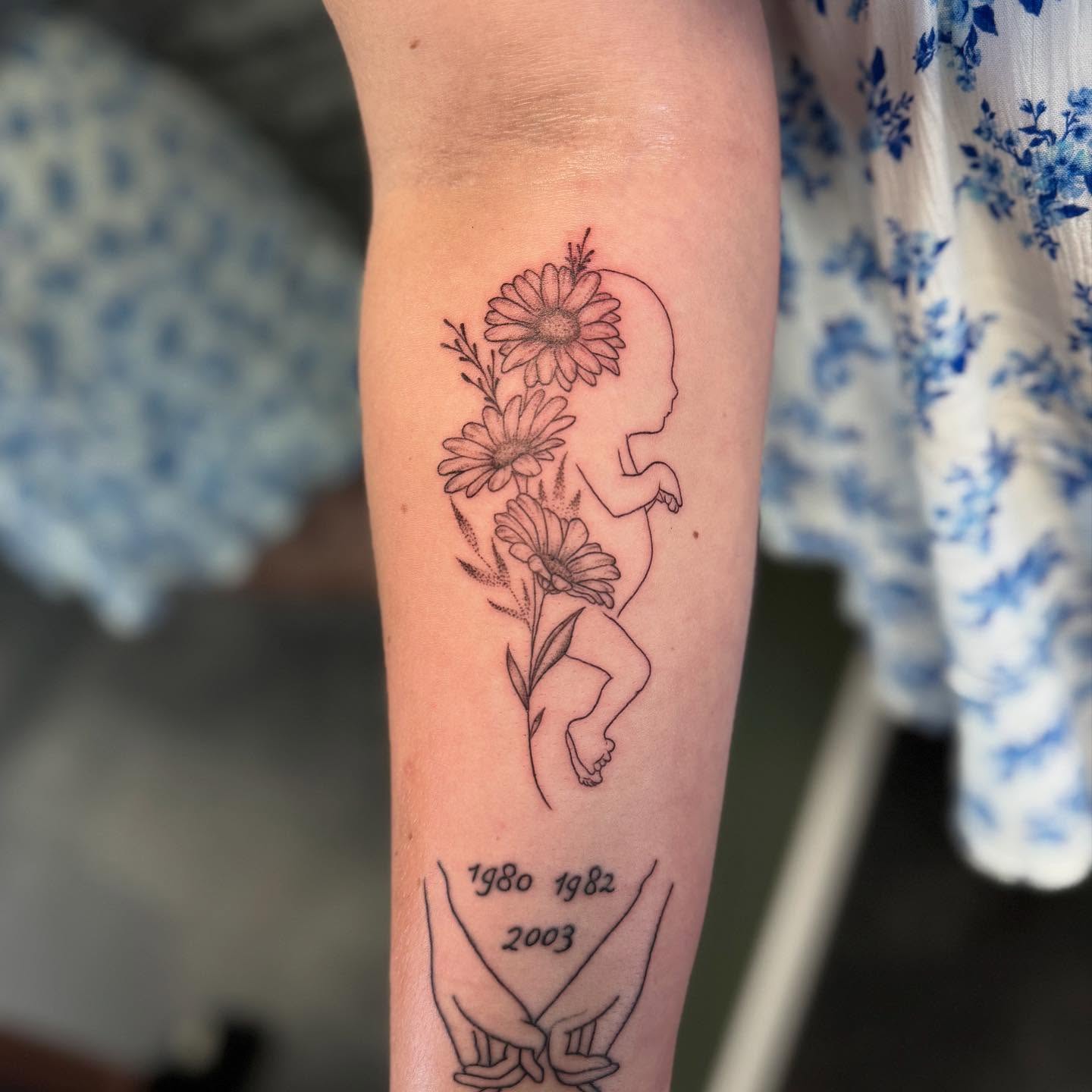 This miscarriage tattoo features a delicate baby silhouette intertwined with blooming flowers, symbolizing life, growth, and gentle remembrance.