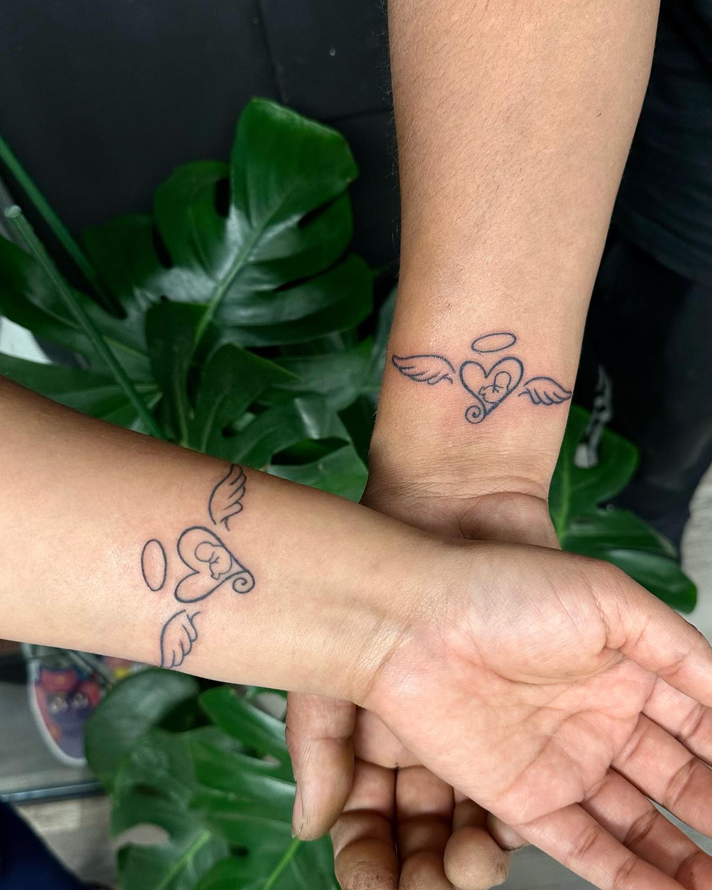 These matching miscarriage tattoos feature small hearts with delicate wings and a halo above, symbolizing a baby remembered as an angel.