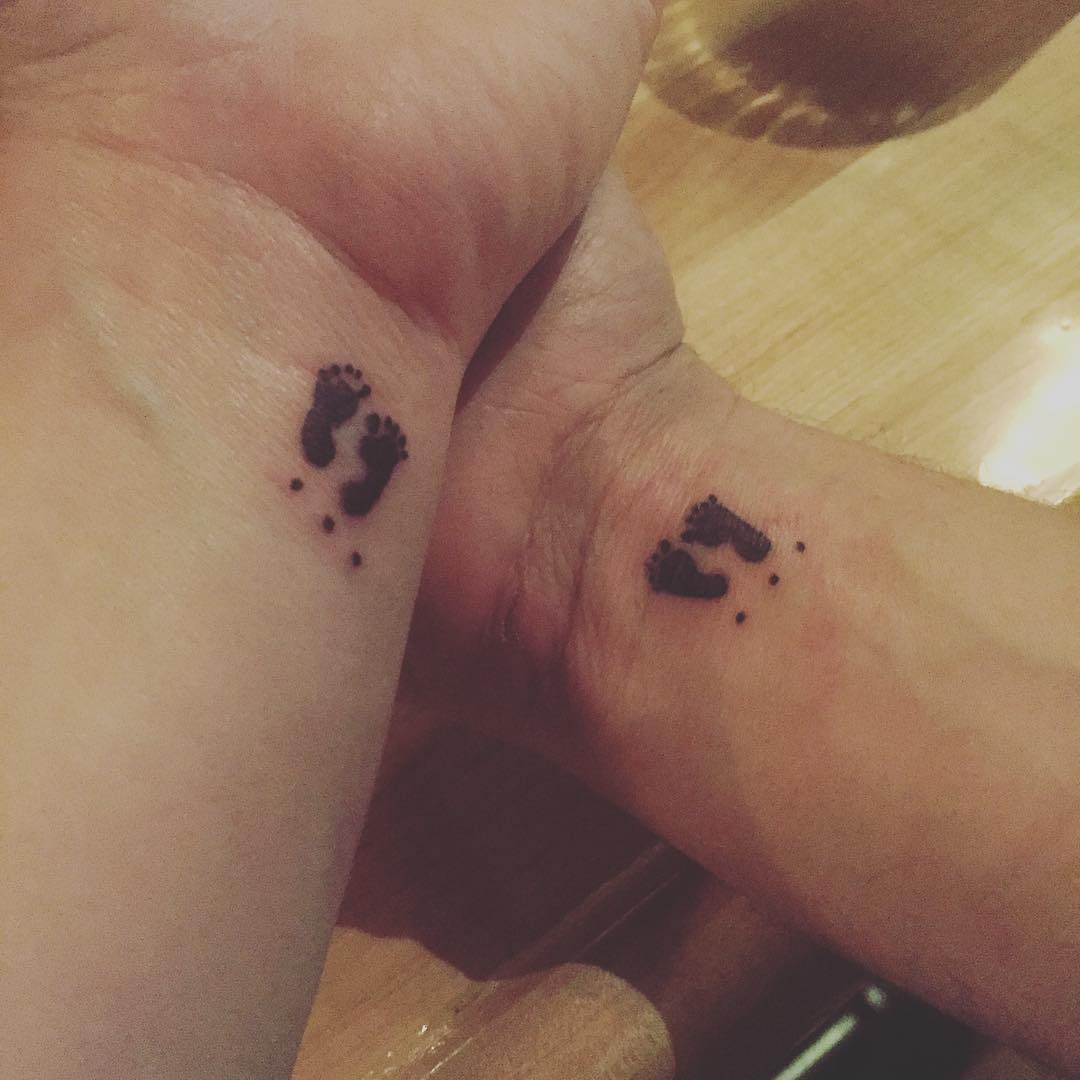 These matching miscarriage tattoos feature tiny baby footprints, symbolizing a precious life remembered and forever cherished.