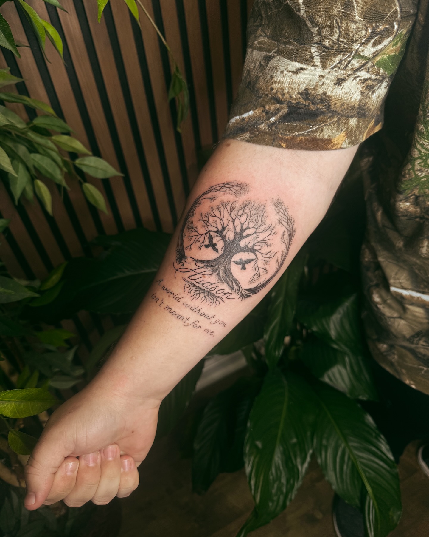 Small birds within the design suggest a spirit carried beyond the physical world. Beneath the tree, a meaningful quote adds a deeply personal message of longing and devotion.