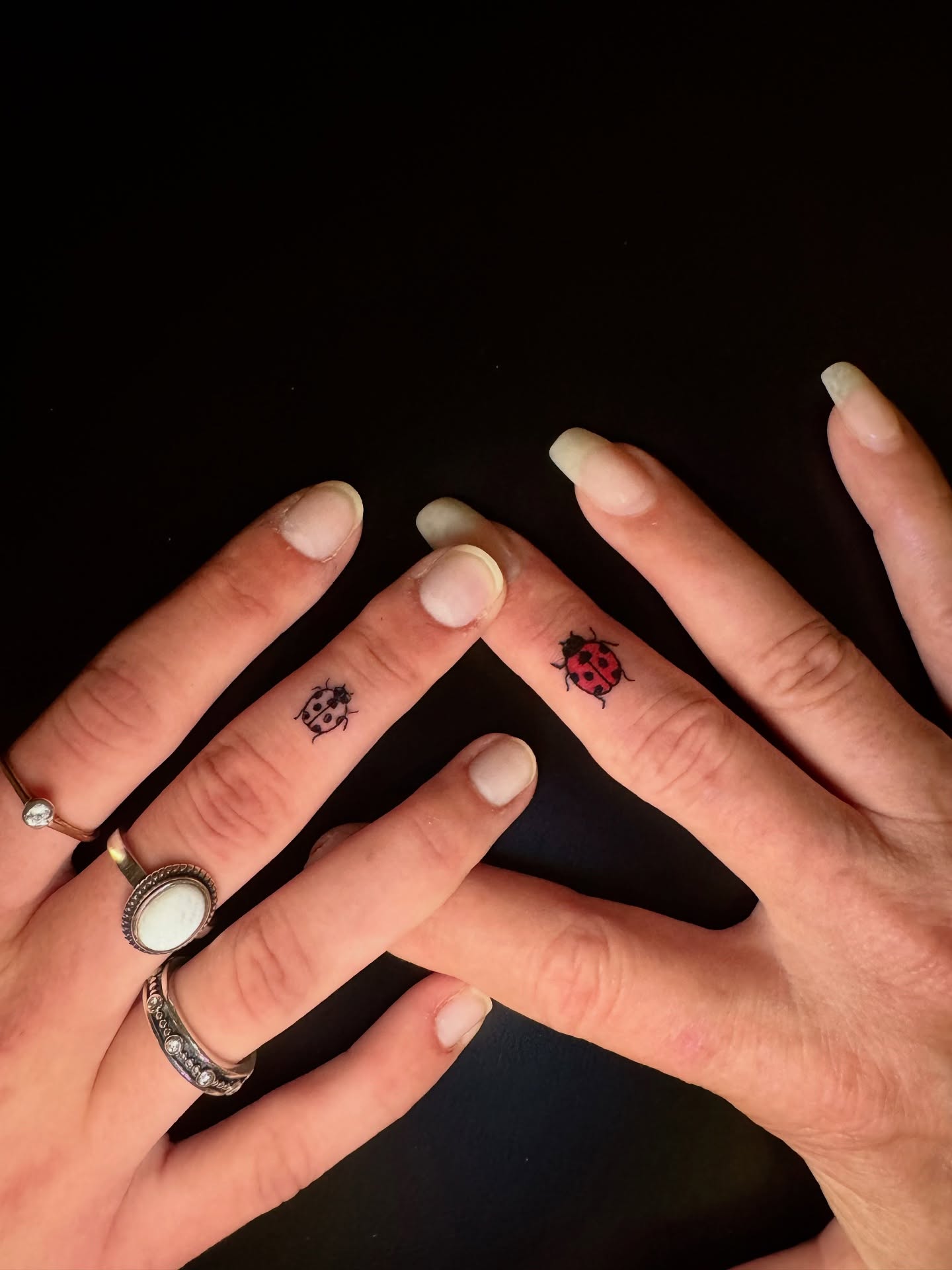 This mom and daughter tattoo features two tiny ladybugs placed on the fingers, creating a playful and meaningful design.