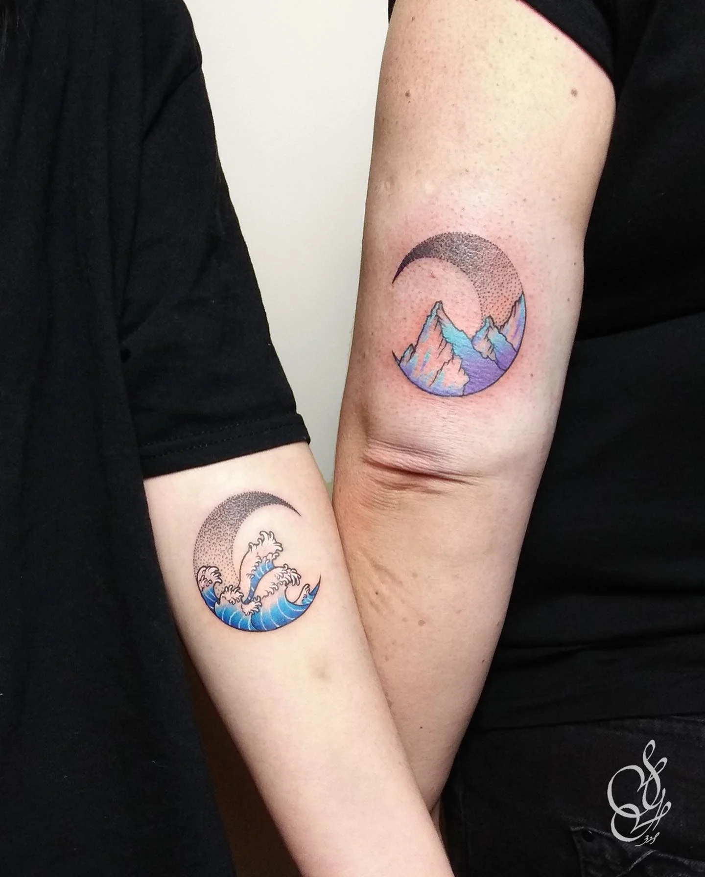 This mom and daughter tattoo pairs two crescent shapes filled with different landscapes.
