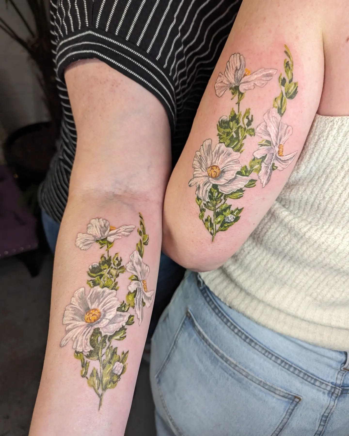 Each cluster curves along the forearm, giving the artwork movement and helping it flow with the shape of the arm. Matching placement ties the tattoos together while still letting each one stand on its own.