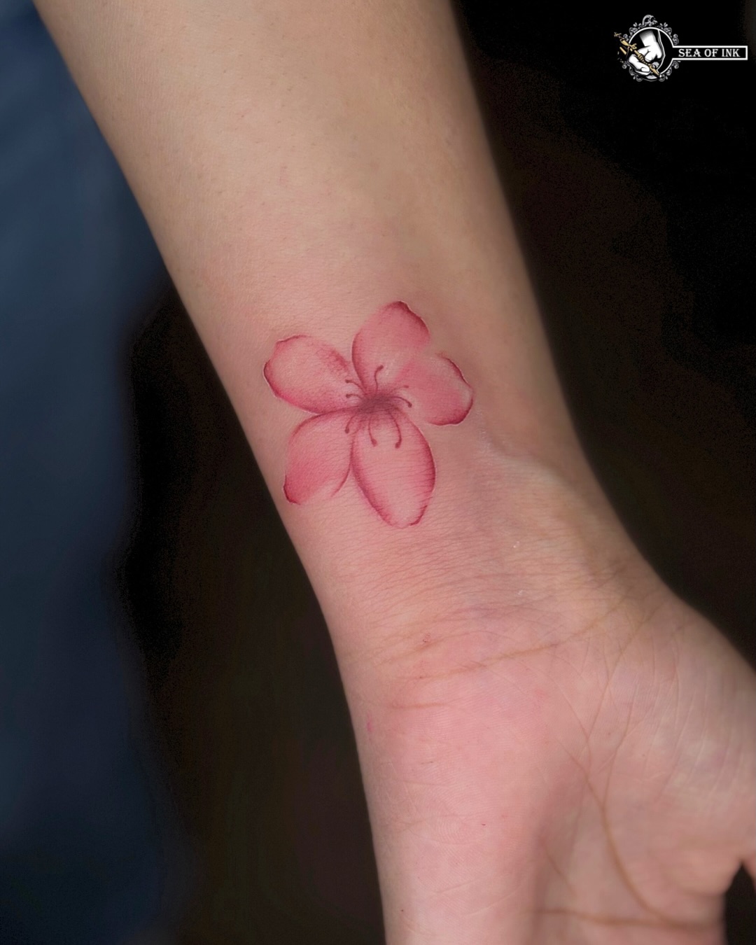 This soft red cherry blossom tattoo feels gentle, airy, and beautifully understated.