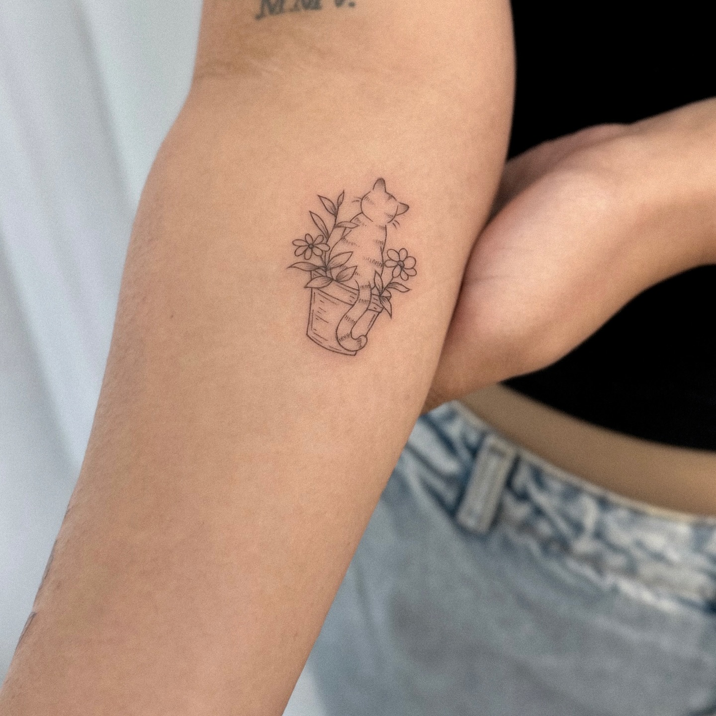 This tattoo shows a small cat sitting inside a flower pot surrounded by simple blooms. The use of clean lines that keep the design light and graceful.